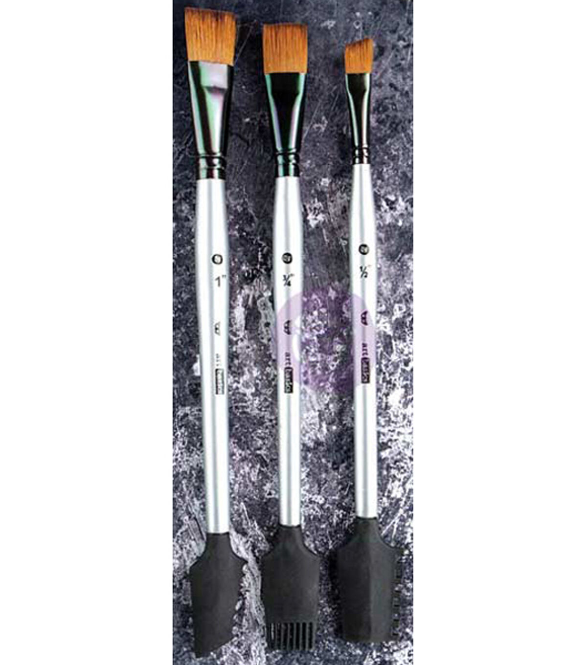 Prima Marketing-Finnabair Art Basics Double Ended Brush Set: Texture #1. These double-ended brushes are easy to clean and ideal for use on journal pages, artistic scrapbook layouts, collage and home decor. Brushes have soft taklon hair brush on one end and a silicone texture tool on the other. This package contains three brushes in assorted sizes and designs within one 14-1/4x2-3/4 inch vinyl case. Imported.