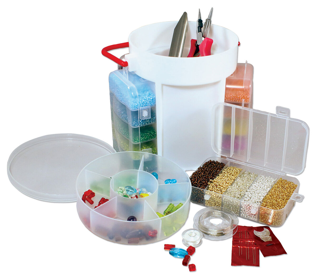 Includes: • 1000 Grams of Seed Beads • 2 Grams of Crimp Beads • 100 Grams of Glass Fashion Beads • 1 Metal Bead Scoop • 1 3-in-1 pliers, Crimping and Cutting Tool • 10 Yards of Beading Wire • 1 Spool of Beading Thread • 6 Beading Needles with Threader • 1 Portable Caddy with Carrying Handle and 6 Detachable Organizers