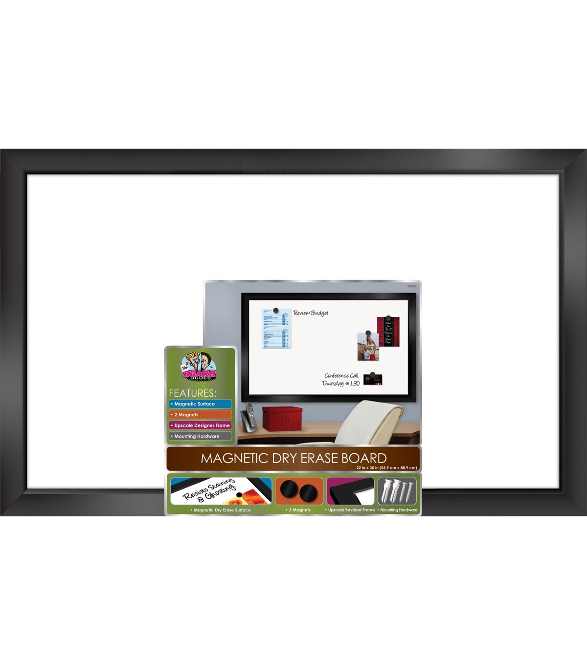 Infuse a contemporary feel into your home or office decor with the The Board Dudes Magnetic Dry Erase Board with Black Frame. It is designed with a professional, black beveled frame and magnetic dry erase surface. This pack includes a dry erase board, two magnets for displaying pictures or notes, and mounting hardware for easy installation.