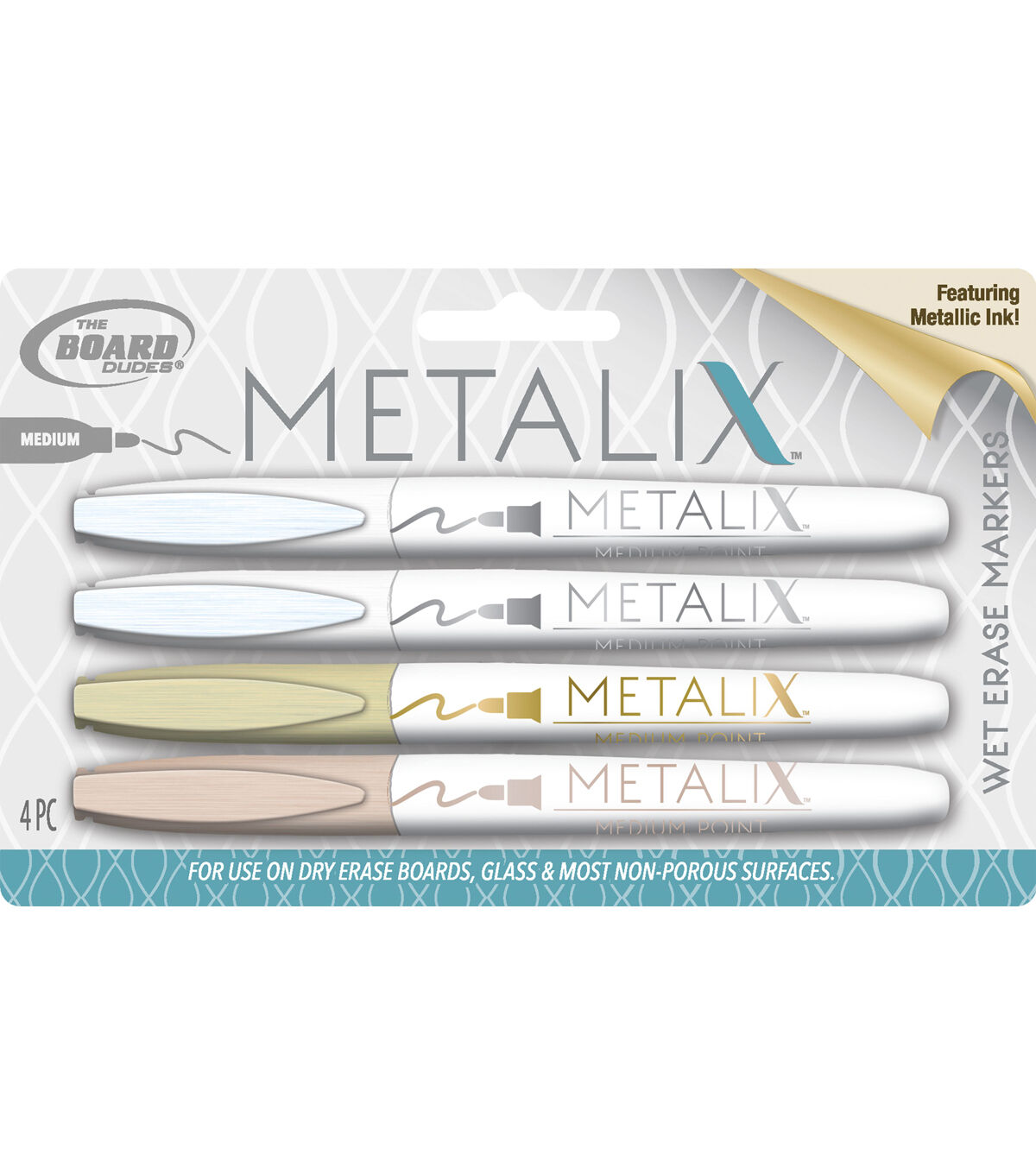 Customize any home, school or work project in detail with The Board Dudes Metalix Medium Tip Wet Erase Markers. Choose from one of the three color options that they come in, each set sold separately. You can create or write with as much detail as needed on any dry erase surface, and erase your work easily with water. This set includes four fine point markers in primary colors.