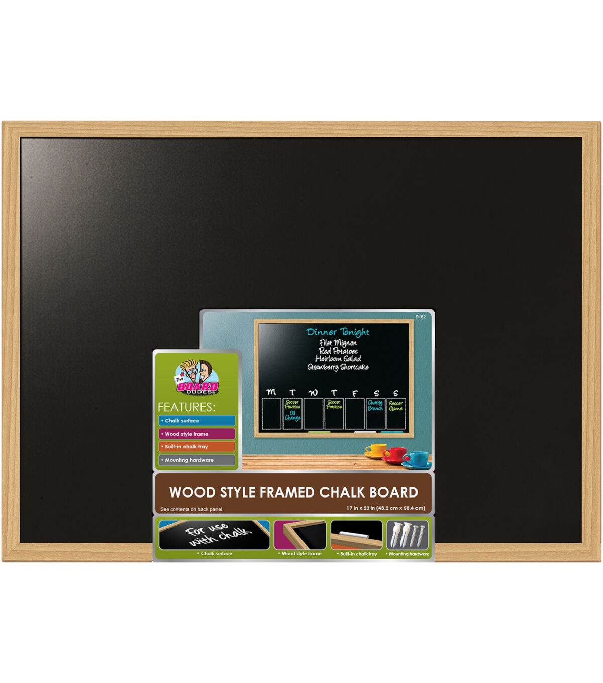 The Board Dudes Wood Style Framed Chalk Board is perfect for displaying your weekly dinner menu or family activities. This pack includes a chalkboard that is designed with a wood-style frame and built-in chalk tray, and mounting hardware.