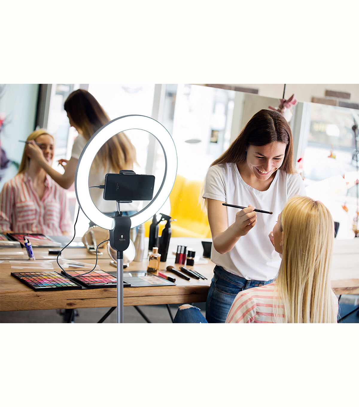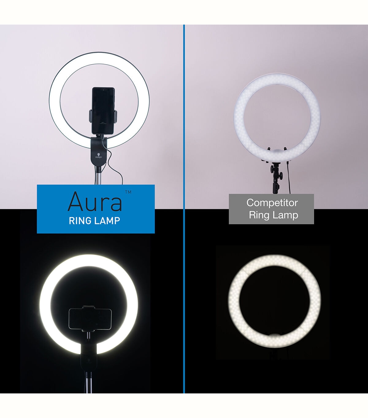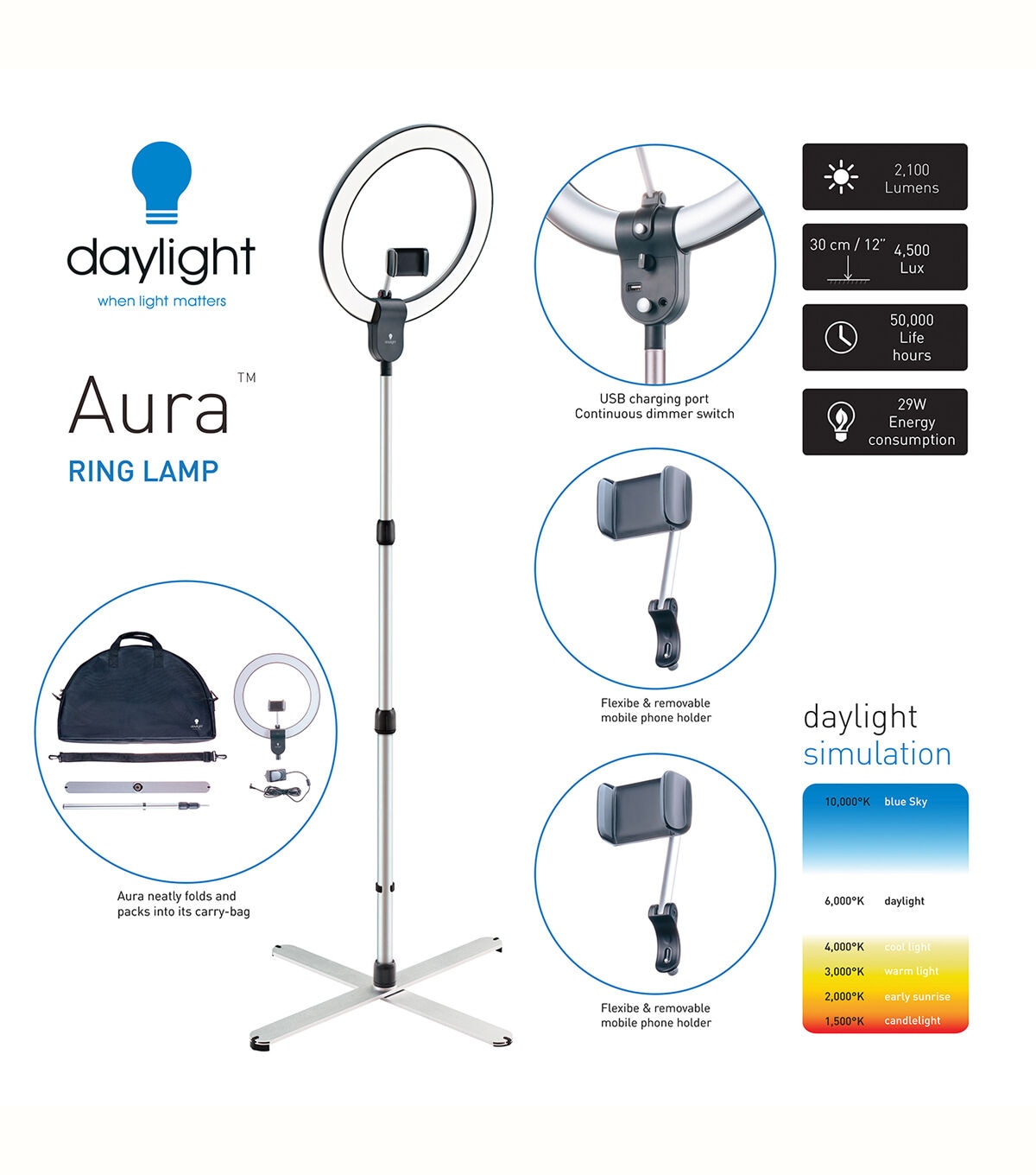 The best way to choose a colour is to see the colour! The high CRI allows you to work in perfect daylight wherever you are. The ring gives an even and shadowless distribution of light. Social Media friendly with a mobile phone holder for YouTubers and Vloggers - the Aura is also lightweight and folds into its carry-bag.
