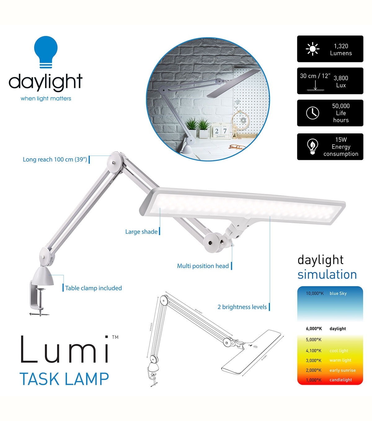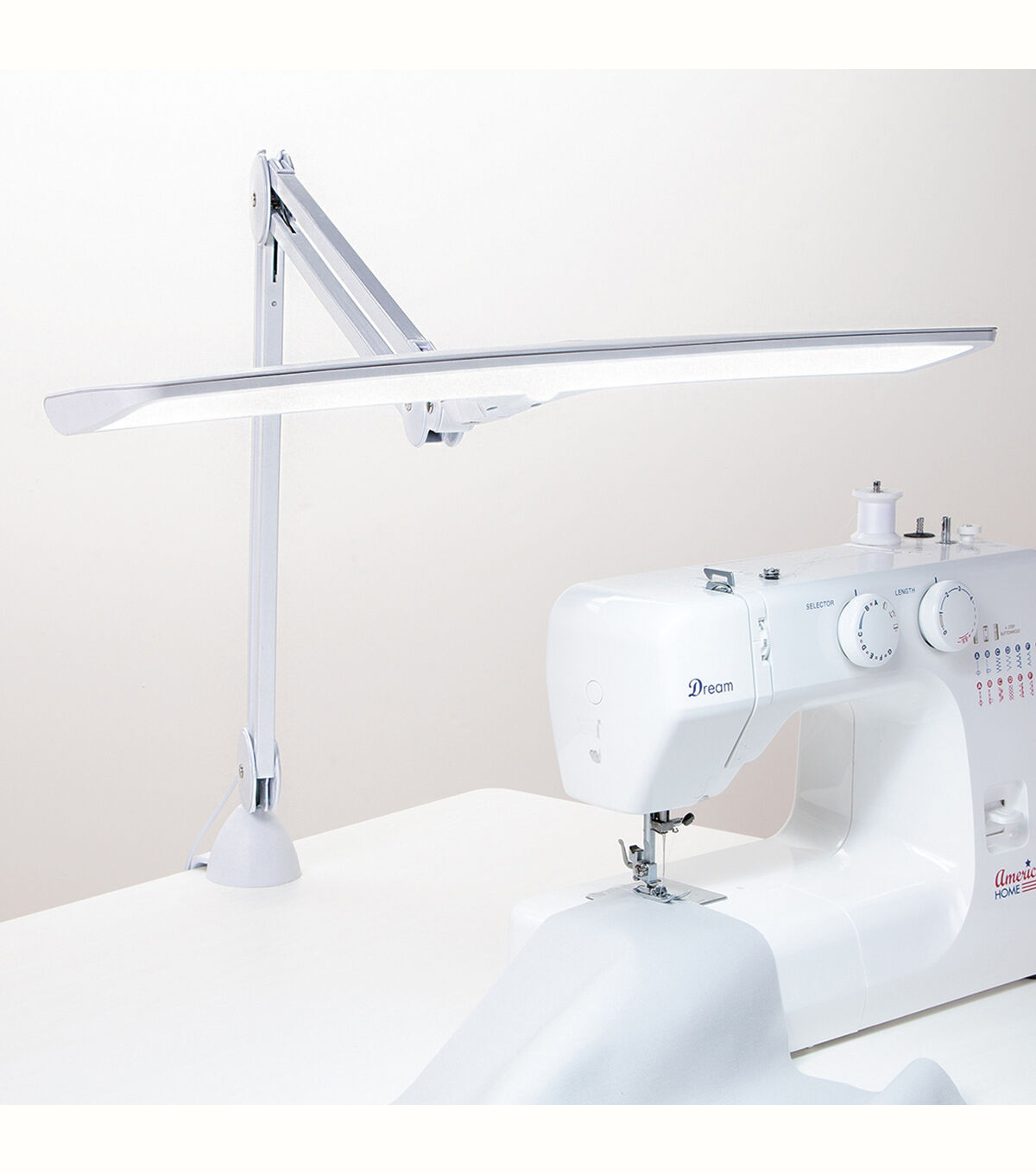 Move and rotate the Lumi vertically, horizontally and laterally to get the perfect position for your task at hand. Ideal for dressmaking, high quality, powerful LEDs illuminate a wide area, enabling you to differentiate each shade, see delicate details clearly and reduce eye strain. Adjust brightness with the 2-step touch dimmer while the free motion, uncovered joints direct light exactly where you need it.