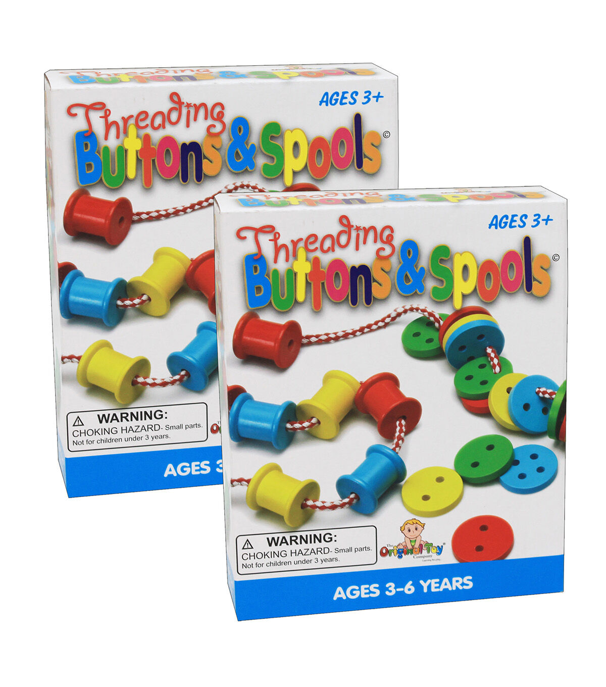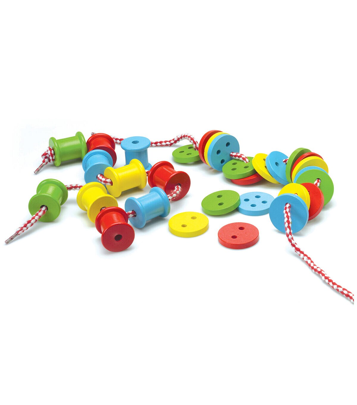 This Classic set of quality wood and thread consist of 20 mulit-colored wooden buttons , 10 multi-colored spools and 2 chunky threading laces ideal for developing hand/eye coordination and manipulative skills. Multi-task learning all in one box. Ages 3-6 years. Includes 2 Threading Buttons and Spool Kits total.