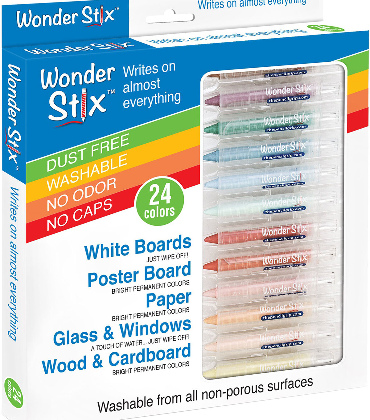 Wonder Stix can write on just about any surface and are easily washable from non-porous surfaces. These vibrant crayons can provide hours of fun and creativity for all ages! This 9x10.5x1 inch package contains 24 colors of 3 inch crayons. Recommended ages 3 years and up. WARNING: Choking Hazard. Not suitable for children under 3 years. Conforms to ASTM D4236. Imported.