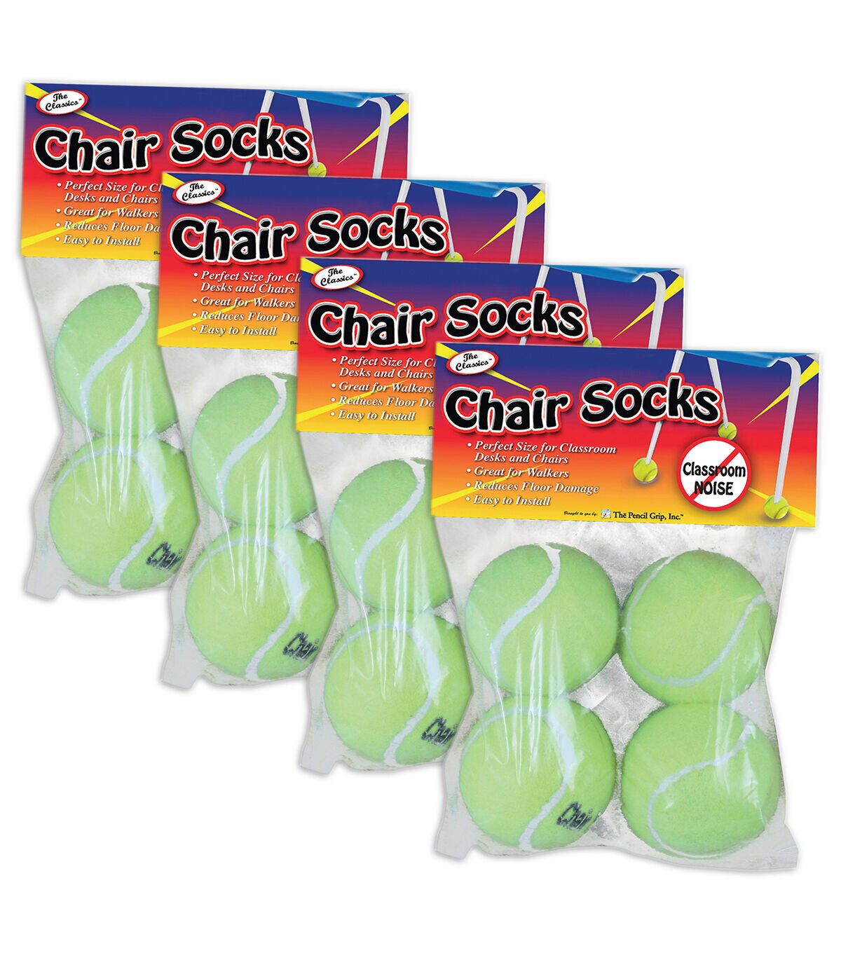 Put an end to classroom clatter with The Pencil Grip The Classics Chair Socks. These chair socks eliminate the distracting noises of shuffling chairs and desks in a classroom setting. They come pre-cut and ready to put on. Assembly is easy, just slip it over the foot of the chair. These socks also fit all standard classroom style chairs and desk legs.