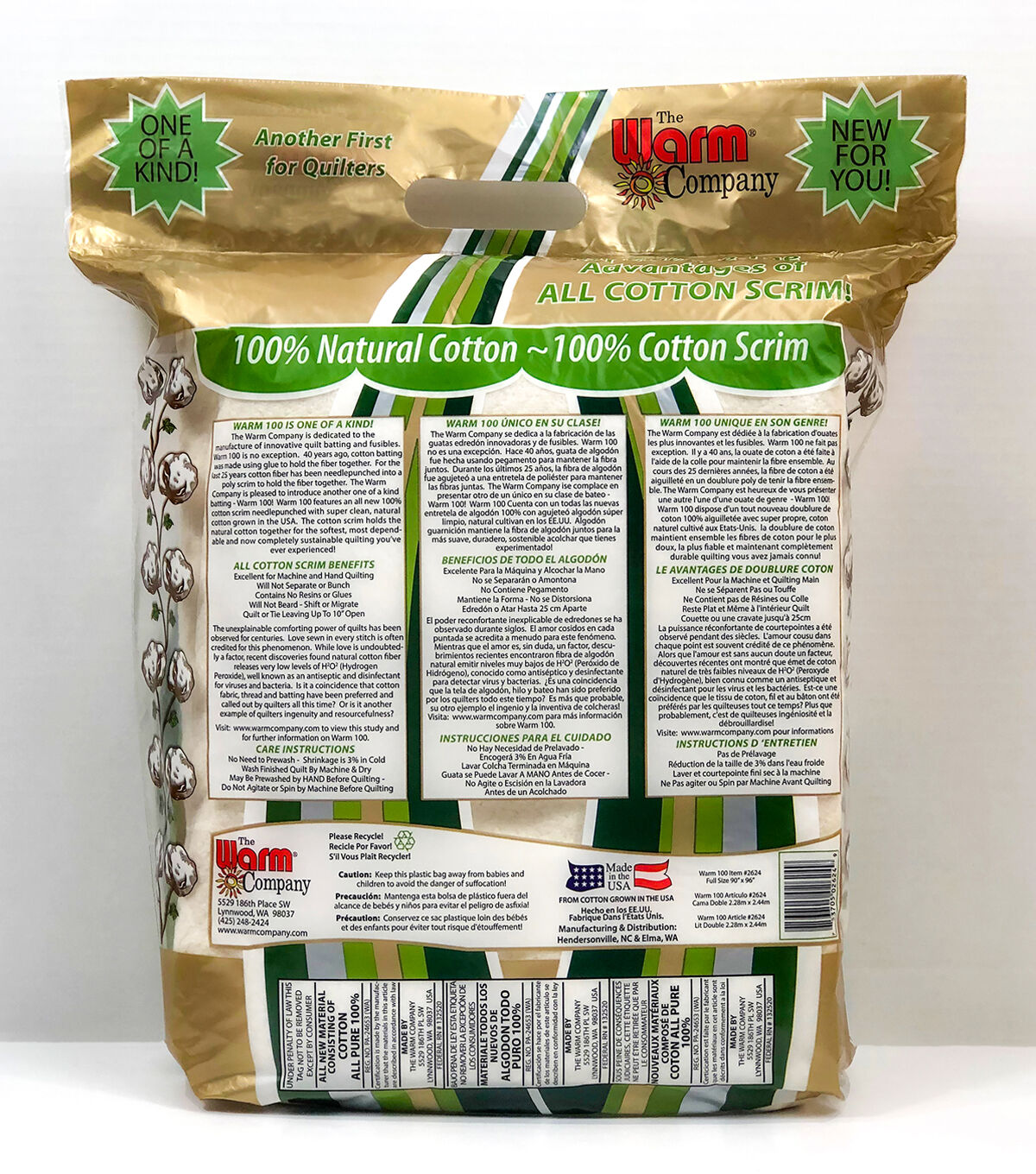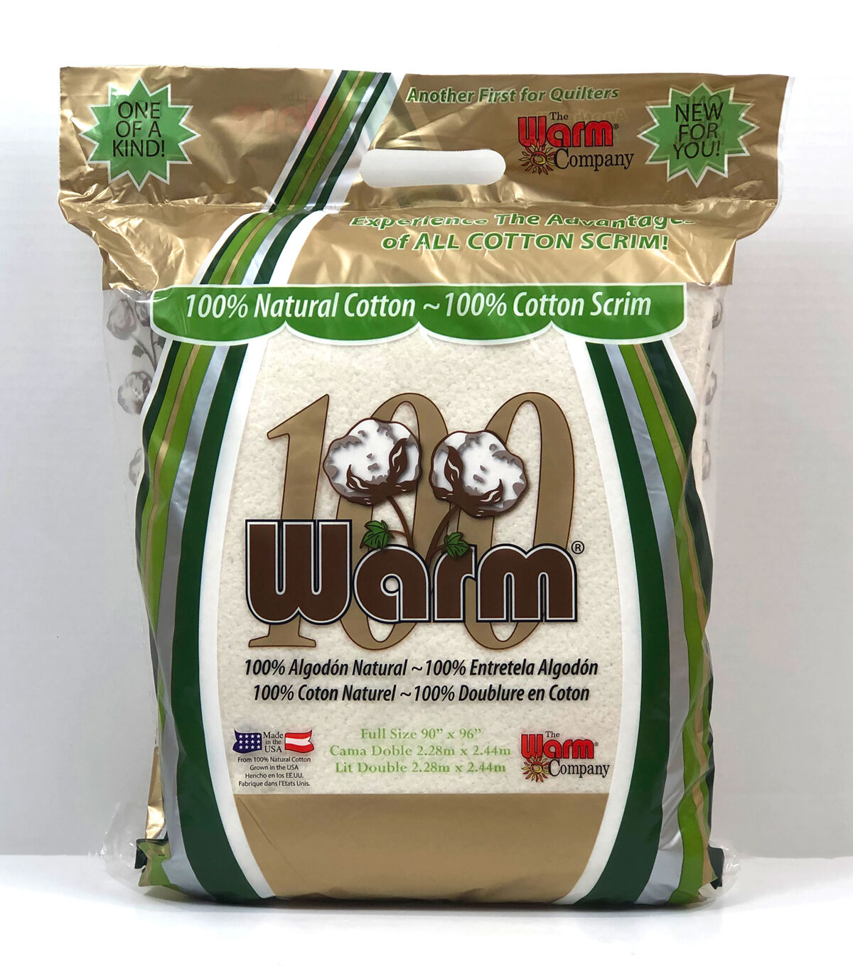 Warm Company-Warm 100 Cotton Batting. Warm 100 is another One-of-a-Kind product from the Warm Company, which is dedicated to the manufacture of the most innovative quilt battings and fusible webs. Warm 100 is no exception. It is the only batting in the world manufactured with 100% natural cotton needled into a 100% cotton screm! State-of-the-art mechanical cleaning removes all debris for super-clearn, natural natural cotton needle-punched into a cotton scrim. The cotton scrim holds the fiber together for the softest, easiest-to-work-with cotton batting you've ever experienced! The masters of cotton quilt batting have done is again. Features breathable cotton warmth with low loft. Easy to quilt by hand or machine. Quilt of tie leaving up to 10 inches open. Once quilted, machine wash cold and dry. Made in USA. up to 10 inches open. Once quilted, machine wash cold and dry. Made in USA.