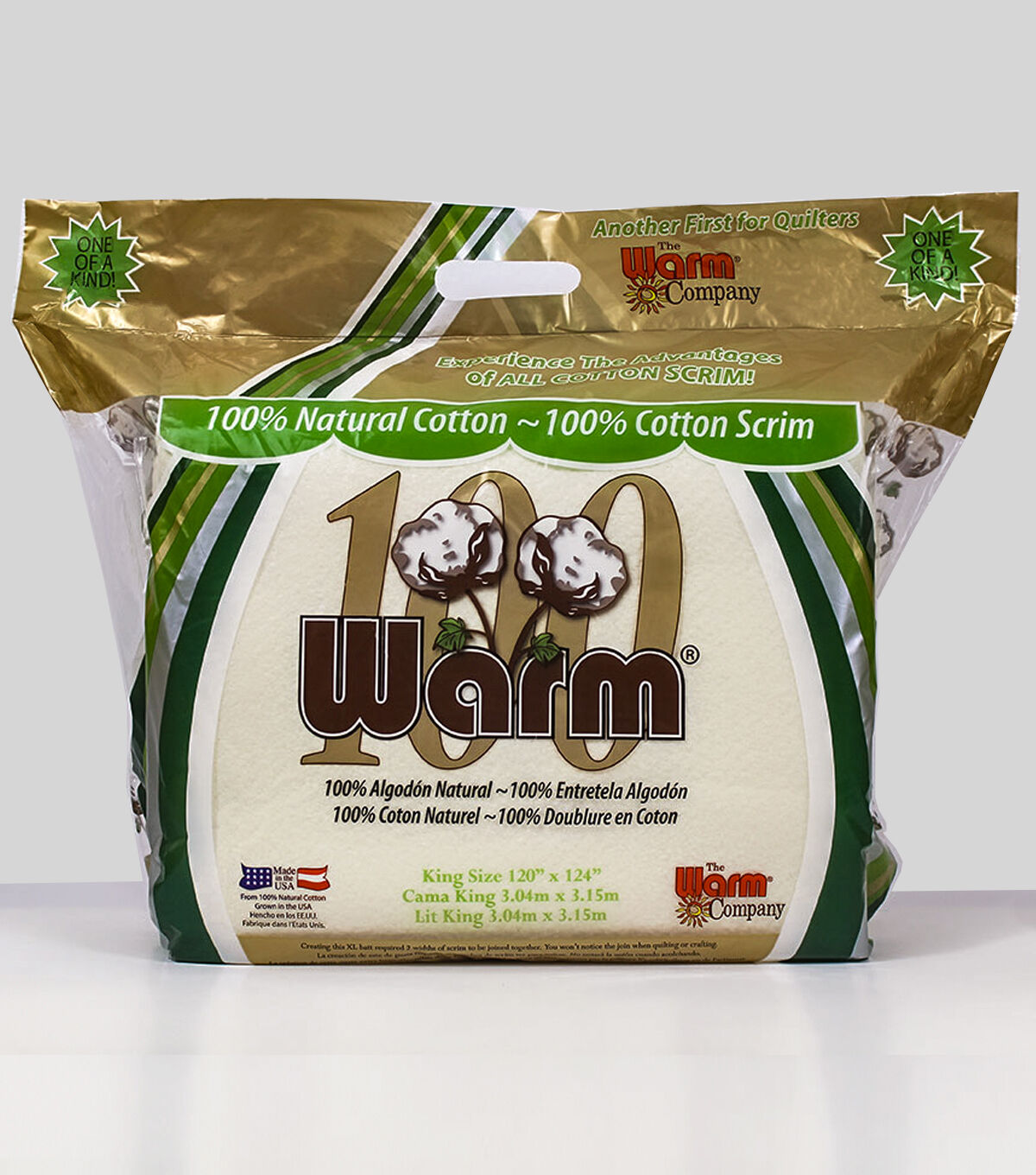 Warm Company-Warm 100 Cotton Batting. Warm 100 is ano ther One-of-a-Kind product from the Warm Company, which is dedicated to the manufacture of the most inno vative quilt batting s and fusible webs. Warm 100 is no ex ception. It is the only batting in the world manufactured with 100% natural cotton needled into a 100% cotton screm ! State-of-the-art mechanical cleaning removes all debris for super-clearn, natural natural cotton needle-punched into a cotton scrim. The cotton scrim holds the fiber together for the softest, easiest-to-work-with cotton batting you've ever ex perienced! The masters of cotton quilt batting have done is again. Features breathable cotton warm th with low loft. Easy to quilt by hand or machine. Quilt of tie leaving up to 10 inches open . Once quilted , machine wash cold and dry. Made in USA. up to 10 inches open . Once quilted , machine wash cold and dry. Made in USA.