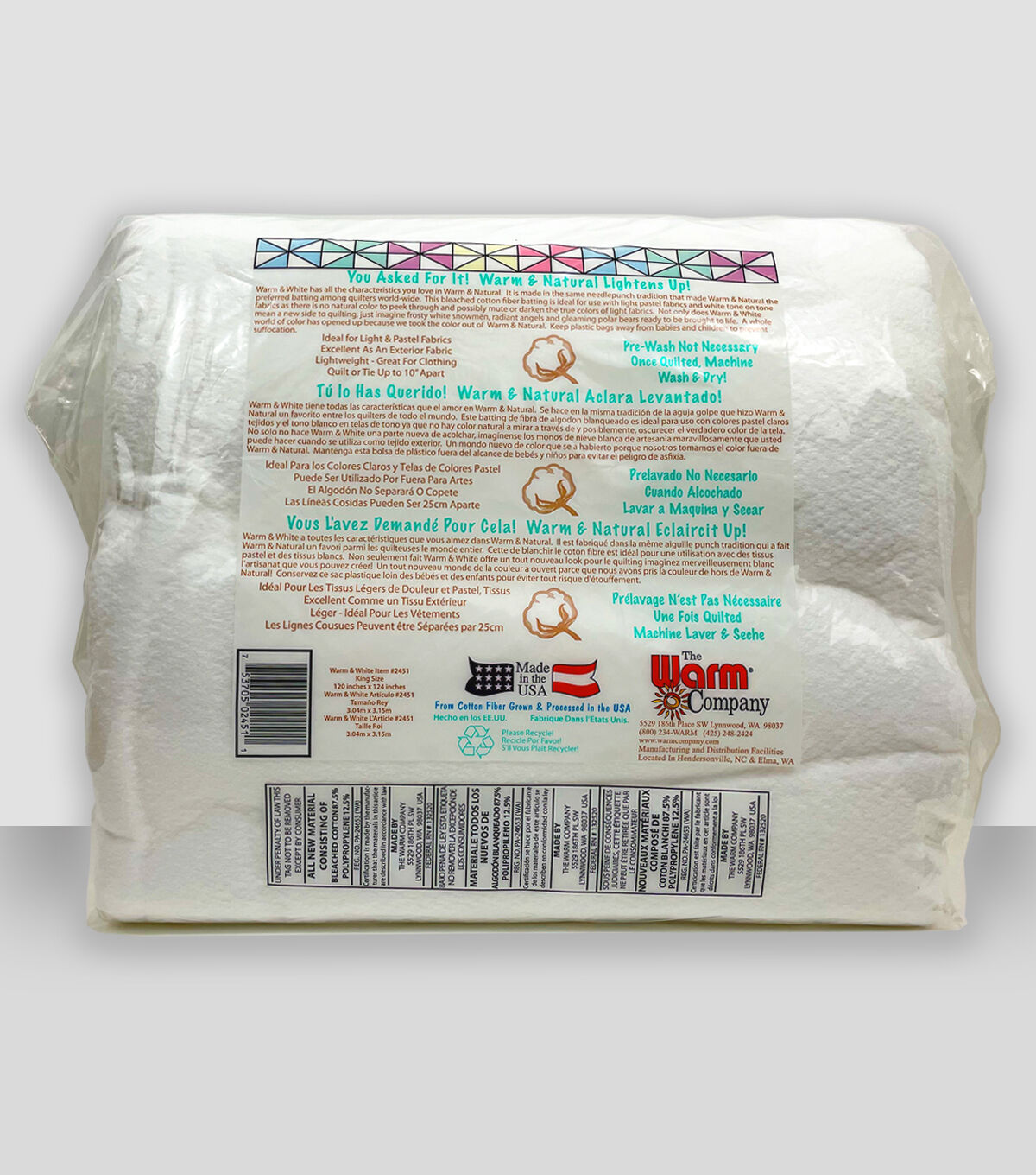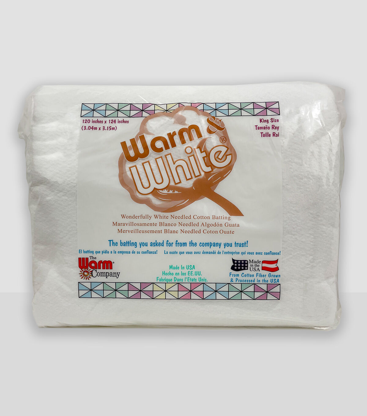 Make your quilting projects as warm and natural as they can be, using the Warm & White Cotton Batting King 120'' x 124''. This bleached cotton batting comes in pure white color, so it does not show through the outer cover fabric. The ideal way to use this white batting is with white tone-on-tone fabrics or soft pastels. It is light, smooth and uniform and is a great choice for clothing. This low-loft batting is easy to needle too.