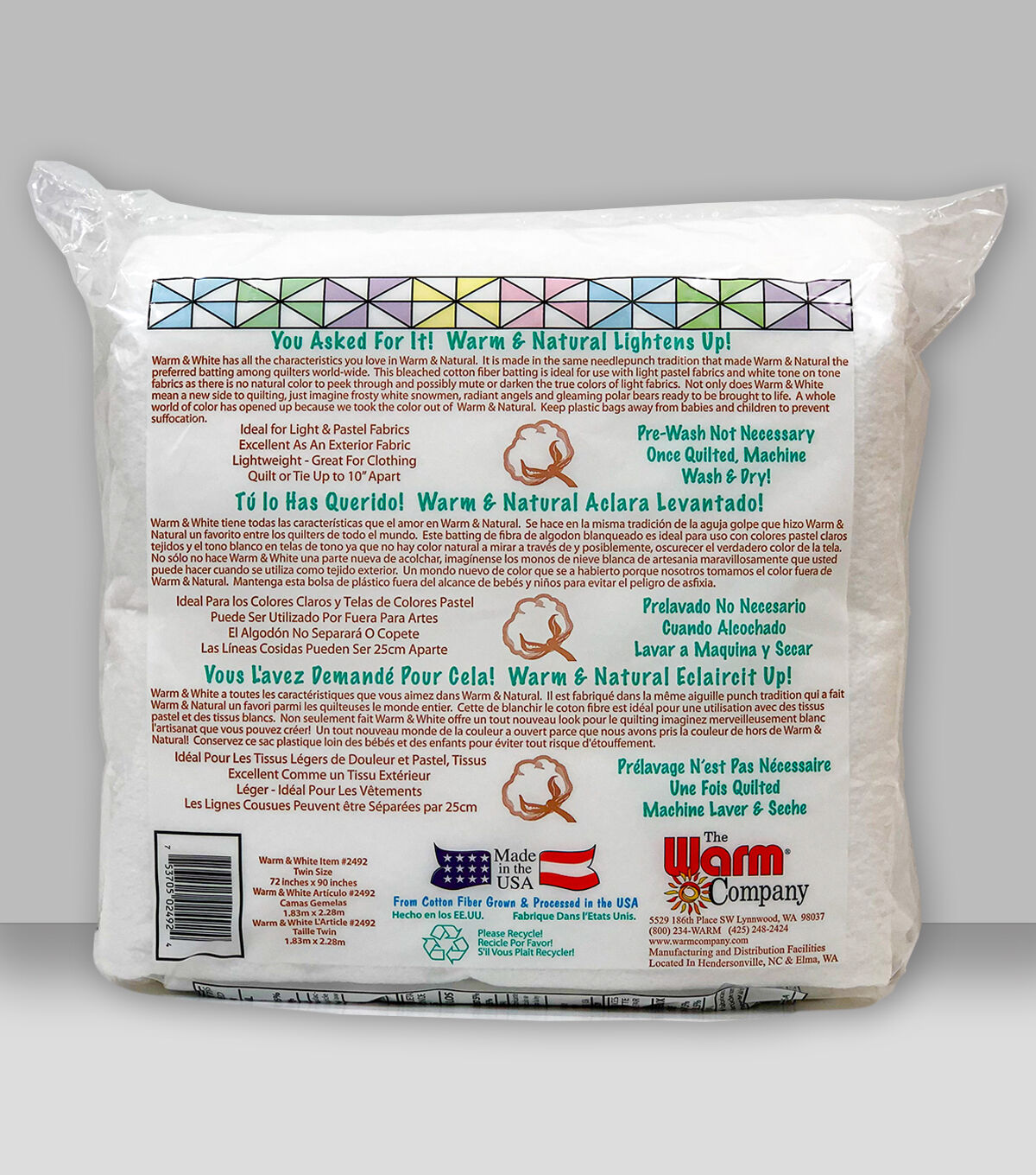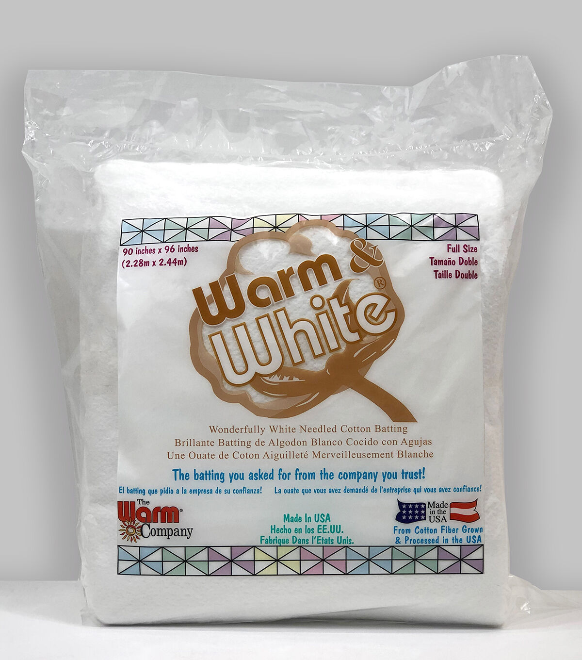 Make your quilting projects as warm and natural as they can be, using the Warm & White Cotton Batting King 90'' x 96''. This bleached cotton batting comes in pure white color, so it does not show through the outer cover fabric. The ideal way to use this white batting is with white tone-on-tone fabrics or soft pastels. It is light, smooth and uniform and is a great choice for clothing. This low-loft batting is easy to needle too.