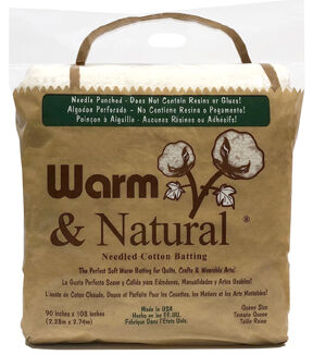 Create eye-catching quilting projects using The Warm Company Warm & Natural Queen Size Batting. This pack features a 90 x 108 inches, 100-% natural, needled cotton batting. Perfect for vintage or modern style queen-sized quilts, this batting also works for baby beddings, wall hangings and other quilted accessories or wearables. It is resistant to shifting, tearing or migration and lasts well without bunching and bearding even after years of gentle washing. Resin and glue-free, it is safe for everyday use.