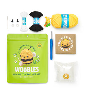 Introducing Cornelius the Bee - The Woobles Bee Crochet Kit. The Woobles Bee Crochet Kit is perfect for beginners! The kit includes all the materials you need, plus step-bystep video tutorials that expertly guide you through each stitch and technique that matches the kit in your hands. These tutorials are designed to take the stress out of starting your project and make it easy for new crafters to dive straight into the fun. In addition to the video tutorials, the kit includes everything you need to get started on your crochet journey; - Pre-started character - Custom-made Easy Peasy yarn that cannot fray - 4mm crochet hook - Stuffing - Plastic eyes - Tapestry needle - Stitch markers With this kit, you'll be able to create an adorable Wooble that you can keep for yourself or give as a heartfelt gift. The skills you learn from this kit will enable you to crochet a wide range of other projects, including other Woobles!