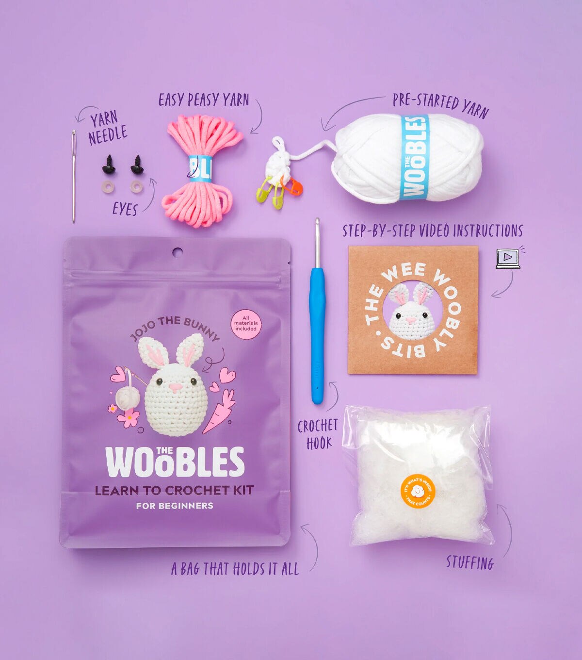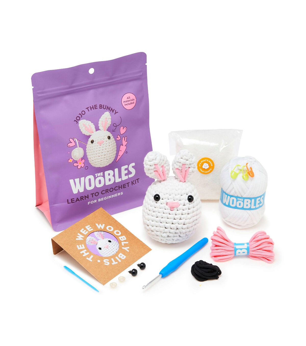 Introducing Jojo the Bunny - The Woobles Bunny Crochet Kit. The Woobles Bunny Crochet Kit is perfect for beginners! The kit includes all the materials you need, plus step-by-step video tutorials that expertly guide you through each stitch and technique that matches the kit in your hands. These tutorials are designed to take the stress out of starting your project and make it easy for new crafters to dive straight into the fun. With this kit, you'll be able to create an adorable bunny that you can keep for yourself or give as a heartfelt gift. The skills you learn from this kit will enable you to crochet a wide range of other projects, including other Woobles! In addition to the video tutorials, the kit includes everything you need to get started on your crochet journey: