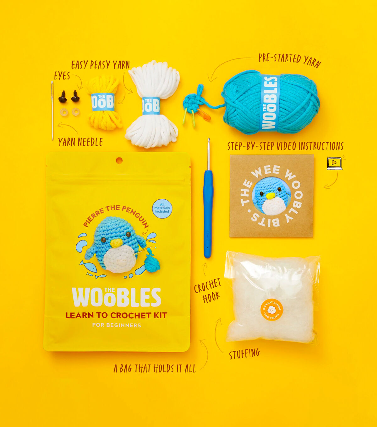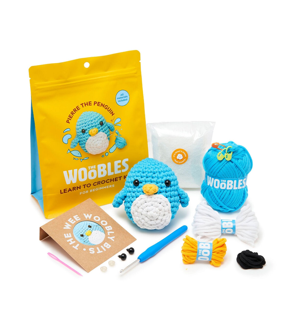 Introducing Pierre the Penguin The Woobles Penguin Crochet Kit. The Woobles Penguin Crochet Kit is perfect for beginners! The kit includes all the materials you need, plus step-by-step video tutorials that expertly guide you through each stitch and technique that matches the kit in your hands. These tutorials are designed to take the stress out of starting your project and make it easy for new crafters to dive straight into the fun. With this kit, you'll be able to create an adorable penguin that you can keep for yourself or give as a heartfelt gift. The skills you learn from this kit will enable you to crochet a wide range of other projects, including other Woobles! In addition to the video tutorials, the kit includes everything you need to get started on your crochet journey: