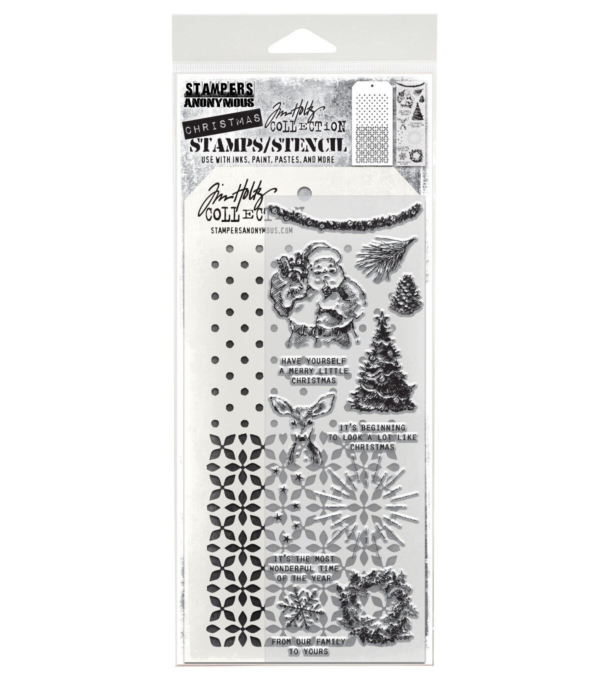 Tim Holtz Mixed Media Set includes clear stamps & a custom layering stencil designed to add texture & imagery to your creativity. Use with your favorite inks, paints, sprays, and pastes for endless mixed media possibilities.