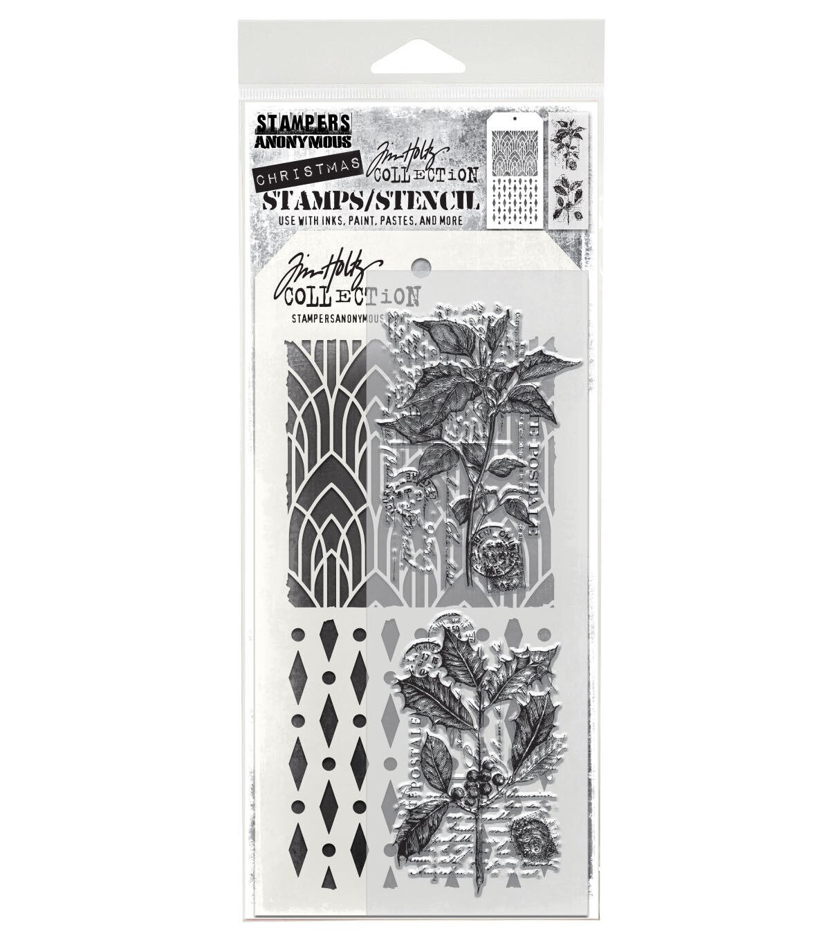Tim Holtz Mixed Media Set includes clear stamps & a custom layering stencil designed to add texture & imagery to your creativity. Use with your favorite inks, paints, sprays, and pastes for endless mixed media possibilities.