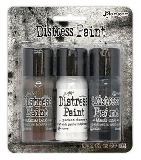 With a timeless matte finish,Tim Holtz Distress Paints are very fluid water-based acrylic paints for use on multiple surfaces. Developed to be reactive with water, like other products in the Distress family, Distress Paints are the perfect choice to accomplish a wide variety of artistic techniques. Use with stamps, paper, wood, metal, glass, plastic and more! Convenient Flip tops are great for quick and easy application of Distress Paint with brushes, blending tools, splatter brush and more. Set includes three 1 fluid ounce bottles.