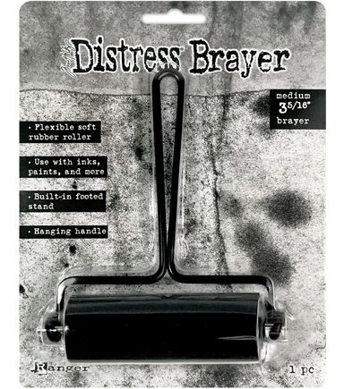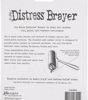 The 3.5 inch Tim Holtz Distress Brayer is ideal for various ink, paint, and texture techniques! Use to apply inks, paints, and mediums to stamps, papers, and mixed-media surfaces. The flexible, soft rubber roller is designed to provide better contact on textured surfaces. Use with Tim Holtz Distress Inks, Oxides, Re-inkers, Paints, and more. Designed with a footed stand to reduce roller dents and help keep work surface clean. Imported.Tim Holtz - Ranger