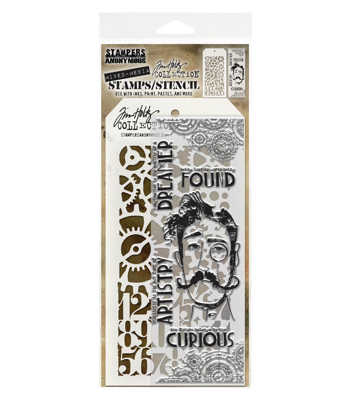 Tim Holtz Mixed Media Set includes clear stamps & a custom layering stencil designed to add texture & imagery to your creativity. Use with your favorite inks, paints, sprays, and pastes for endless mixed media possibilities.