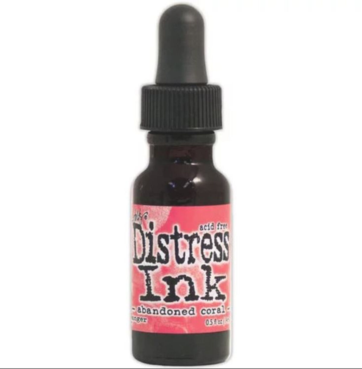 Tim Holtz Distress Ink Re-Inker .5oz-February-Abandoned CoralRanger-Tim Holtz Ink Re Inkers. Create an aged look on papers, fibers, photos and more. The perfect way to re-ink your Ranger ink pads (sold separately)! This package contains one 0.5oz eye-drop bottle of ink re-Inkers. Comes in a variety of colors. Each sold separately. Acid free. Non-toxic. Conforms to ASTM D 4236. Made in USA.