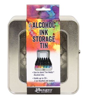 The Tim Holtz Alcohol Ink Storage Tin is the ideal storage solution for Alcohol Ink bottles. Organize and transport Alcohol Inks easily in this convenient tin. Features a clear window, hinged metal closure and a stackable design . Hold up to 30 - 0.5oz Alcohol Ink Bottles. Custom tray keeps Alcohol Inks in place for easy access.
