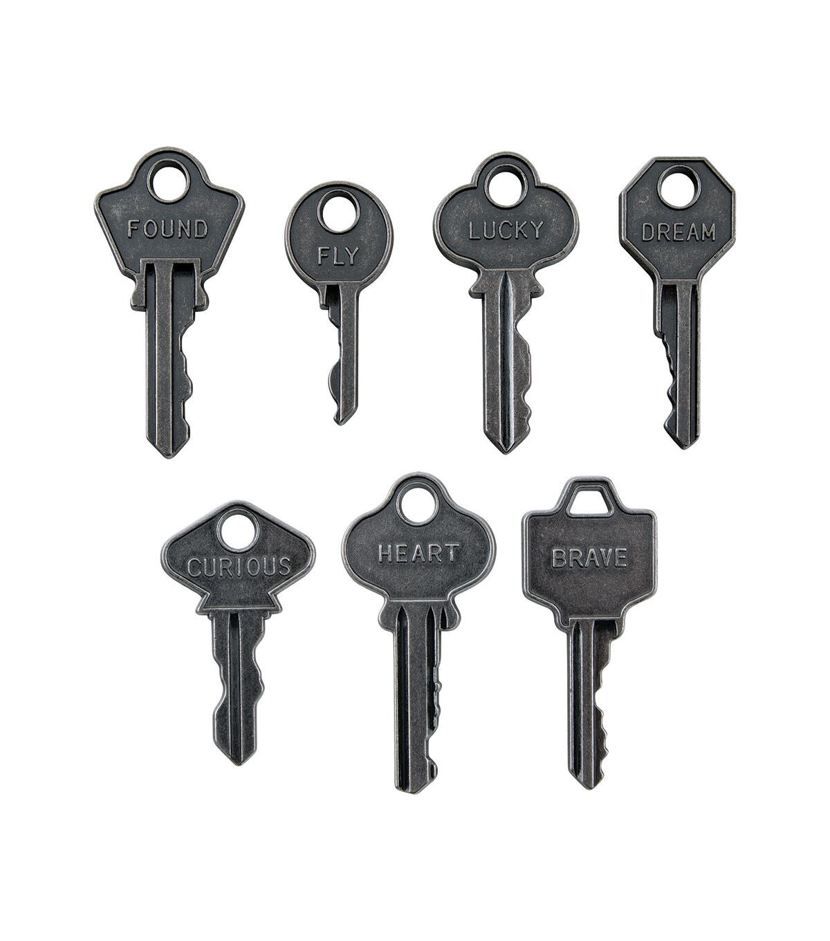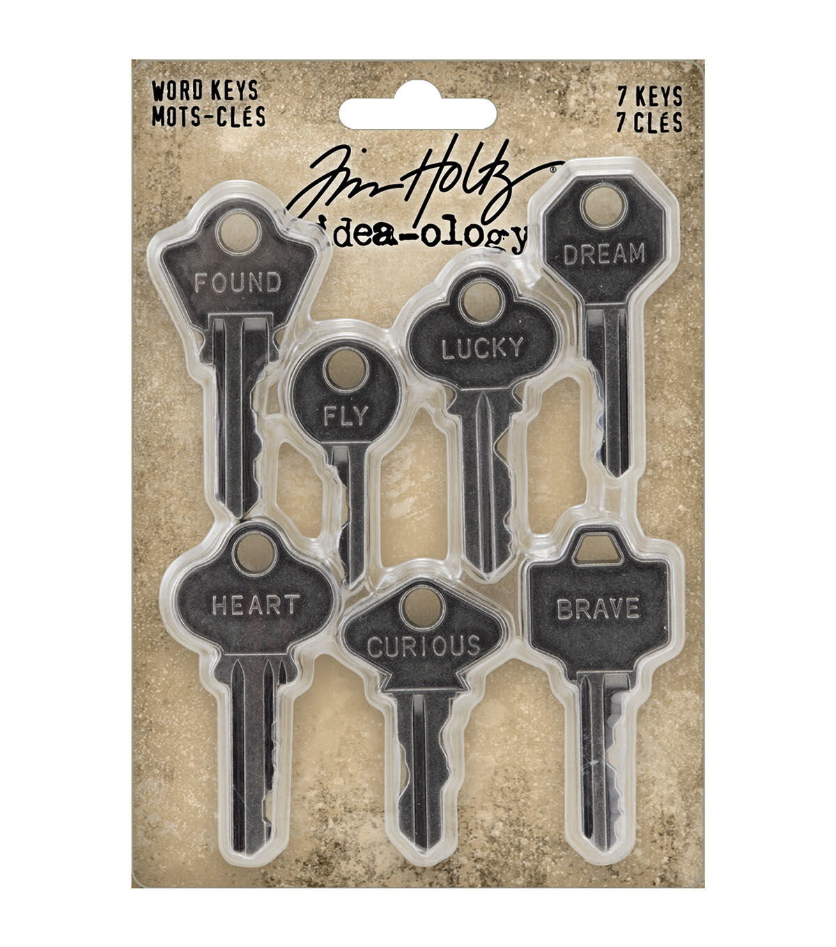 - Word Keys by Tim Holtz are a collection of keys with raised words.