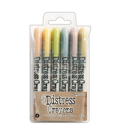 Achieve vibrant coloring effects on porous surfaces, when you use the Tim Holtz Distress Crayon Set #8. These distress crayons have smooth, water-reactive pigments, making them perfect for creating brilliant backgrounds, watercoloring, smudge effects and more in your mixed media projects. Color directly onto your surface and blend with water, then layer with Distress Inks or Stains, sold separately, for more creative possibilities. Colors included in this pack are tattered rose, scattered straw, shabby shutters, weathered wood, old paper and milled lavender.