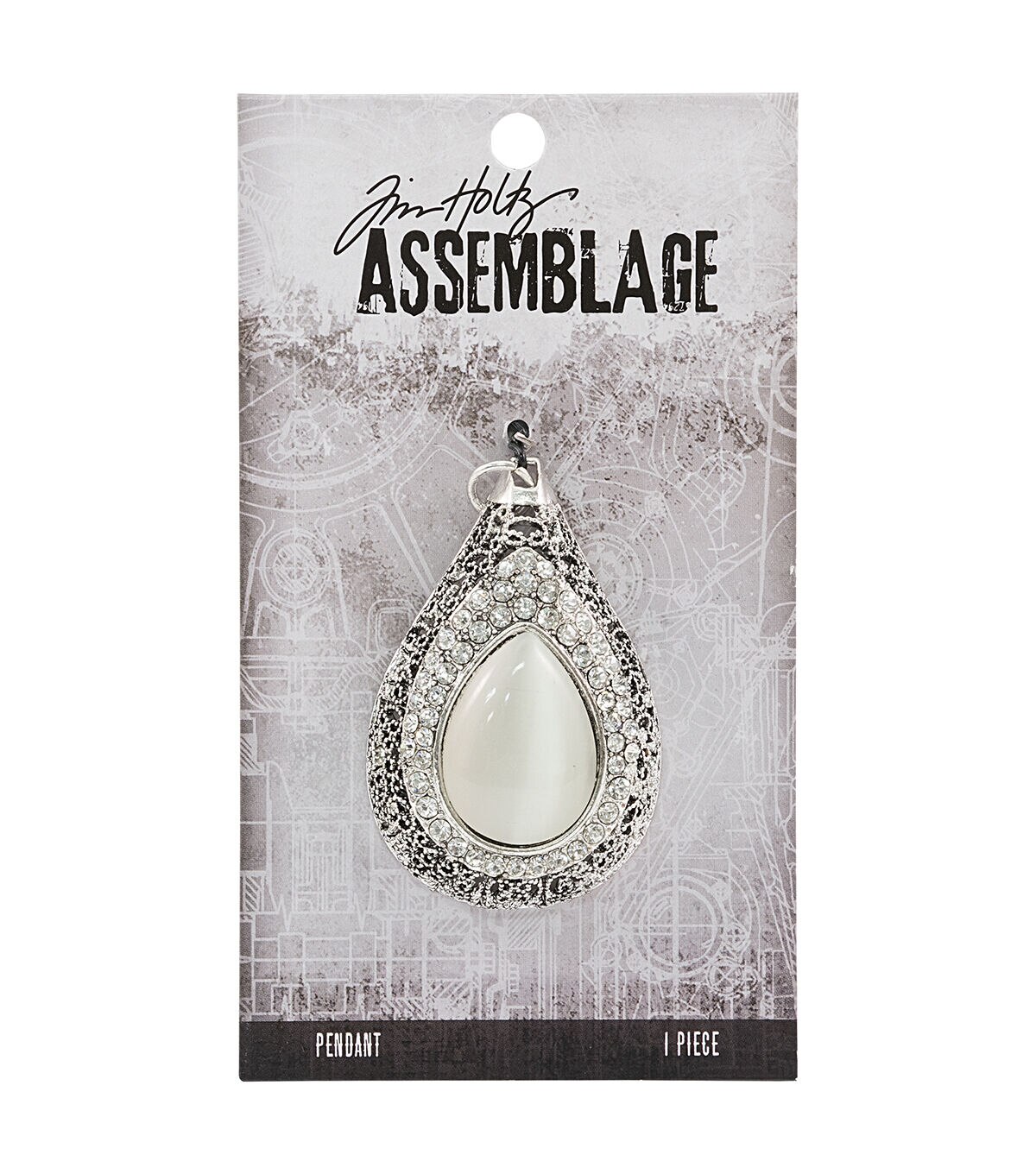 Prettify a simple chain with the Tim Holtz Assemblage Silver Pendant-Opal Dropulent. This large pear-shaped pendant features a large center, opal-like stone surrounded by rhinestones and textured, vintage-style metalwork. It includes a jump ring for easy attachment.