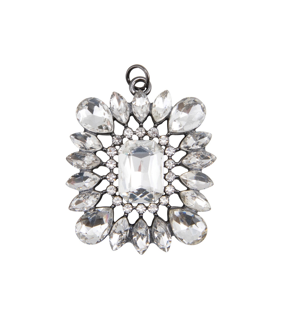 - This faceted pendant features a radiant-cut center rhinestone surrounded by round, marquise and pear cut rhinestones.