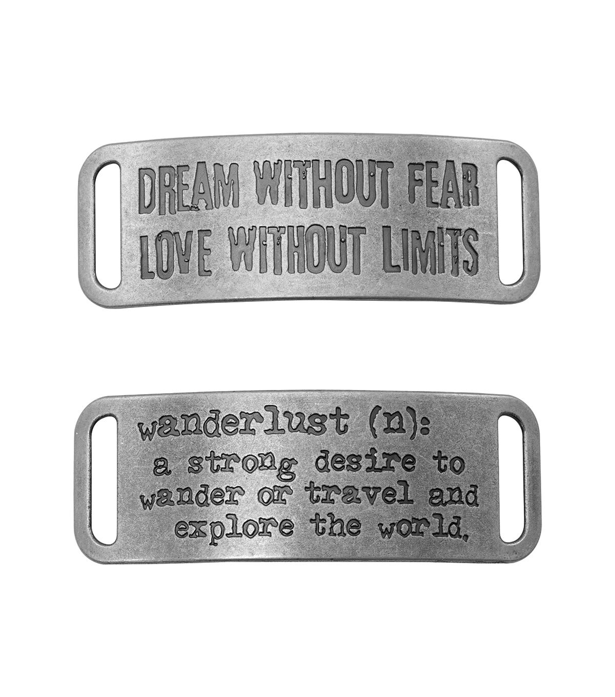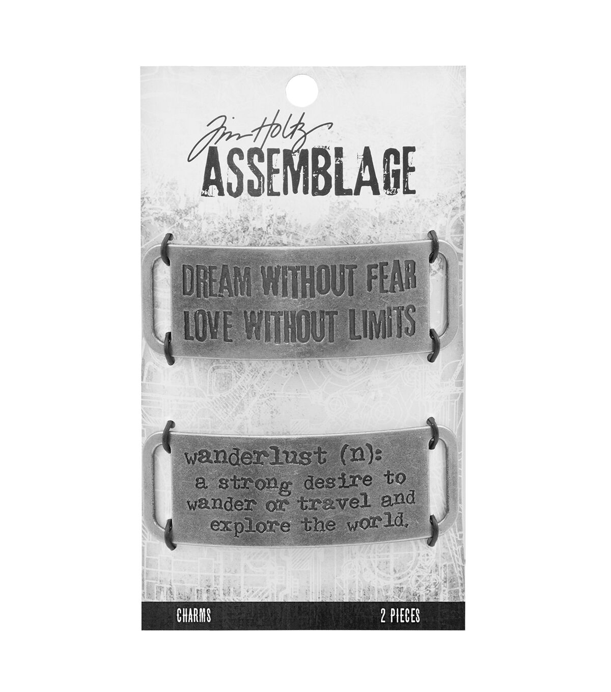 Try the Tim Holtz Assemblage Metal Bands Charms for your next jewelry project. Designed exclusively for JOANN by designer Tim Holtz, the Assemblage collection is a gathering of various elements and unrelated objects to create unique, wearable designs, ranging from vintage shabby and deco glam to urban hipster and industrial. The pack contains slightly curved metal bands engraved with 'dream without fear love without limits' and 'wanderlust'.