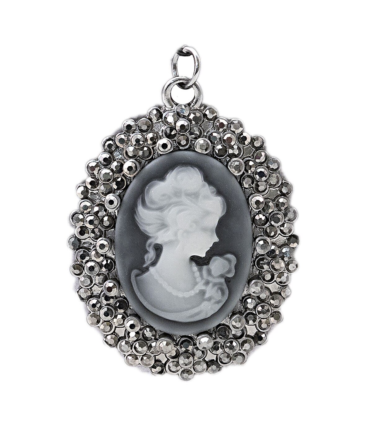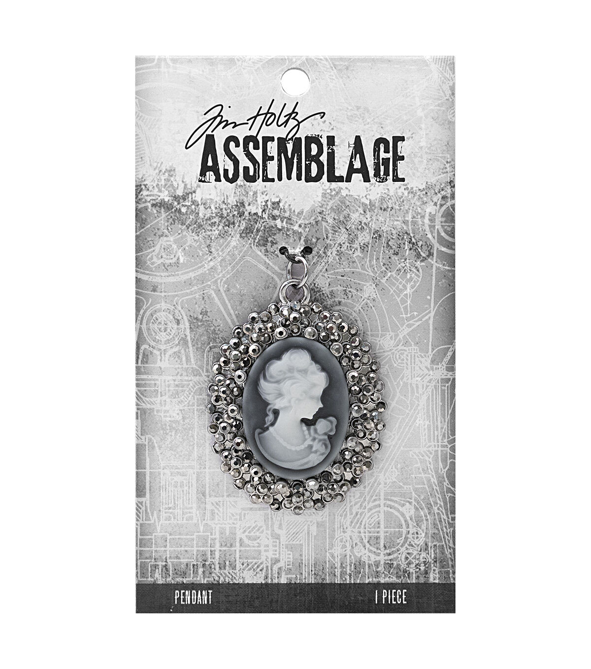Accent your jewelry pieces using the Tim Holtz Assemblage Crystal Cameo Pendant. Designed exclusively for JOANN by designer Tim Holtz, the Assemblage collection is a gathering of various elements and unrelated objects to create unique, wearable designs, ranging from vintage shabby and deco glam to urban hipster and industrial. The pack contains crystal adorned cameo pendant featuring a resin silhouette, black rhinestones and antique silver finishes. It includes a jump ring.