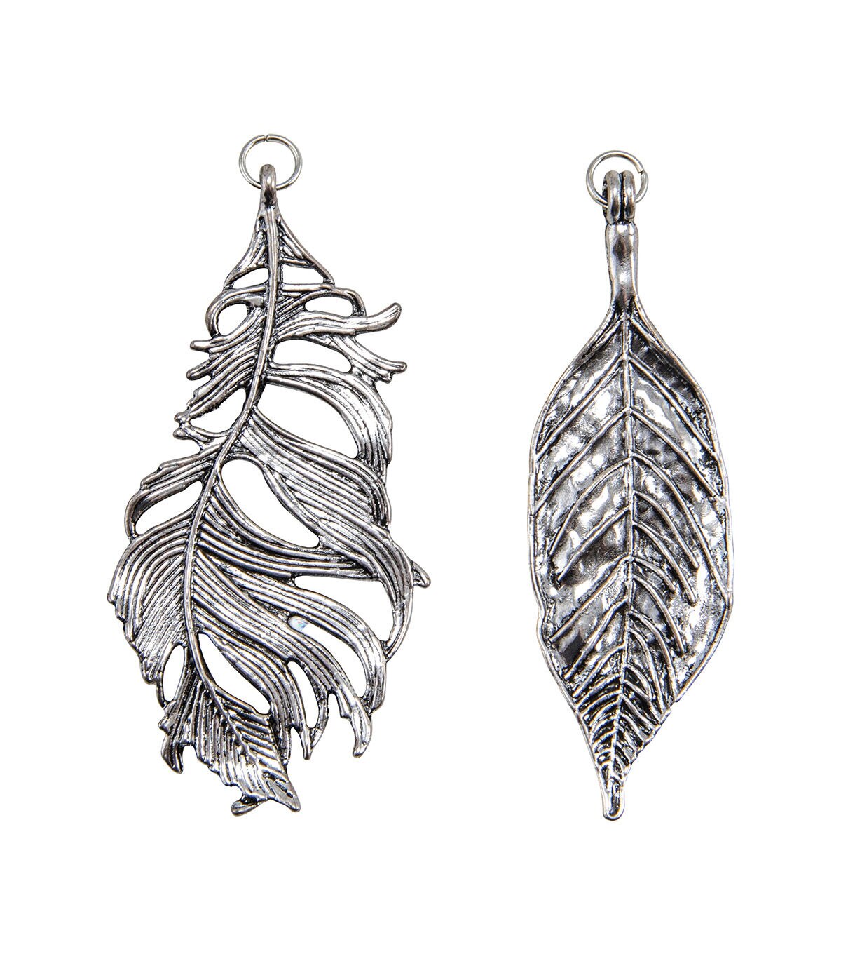 - One leaf-styled charm with raised detailing, and one two-sided feather-styled charm. Both include jump rings.