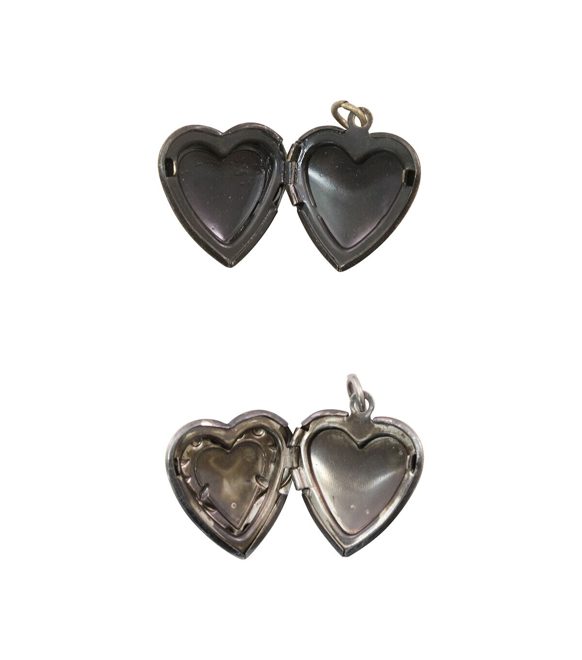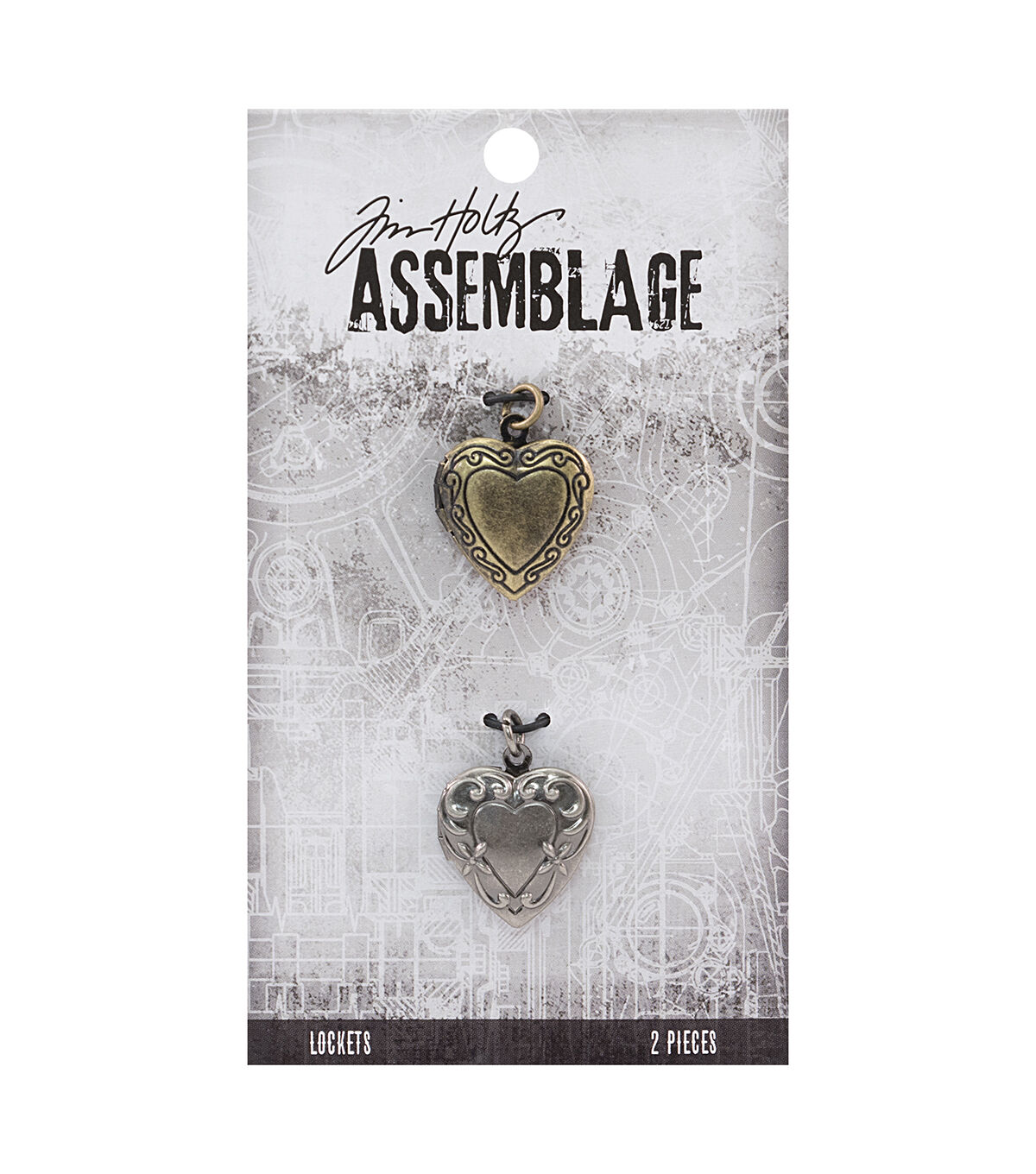 Textured detailing and inset collages make the Tim Holtz Assemblage Ornate Heart Lockets great for unique jewelry projects. This pack contains two 0.75-inch lockets featuring antique finishes. One sports an antique silver finish with floral filigree detailing, and the other one sports an antique brass finish with swirled filigree detailing. Both open from the side and include jump rings.