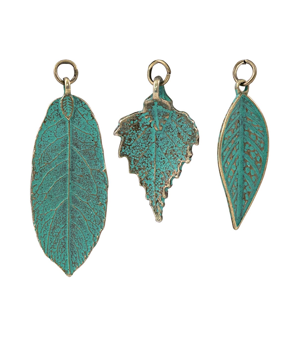 Breathe life into your ideas with the Tim Holtz Assemblage Patina Leaves Charms. Designed exclusively for JOANN by designer Tim Holtz, the Assemblage collection is a gathering of various elements and unrelated objects to create unique, wearable designs, ranging from vintage shabby and deco glam to urban hipster and industrial. The pack contains three patina leaf charms in various sizes. All three include jump rings.