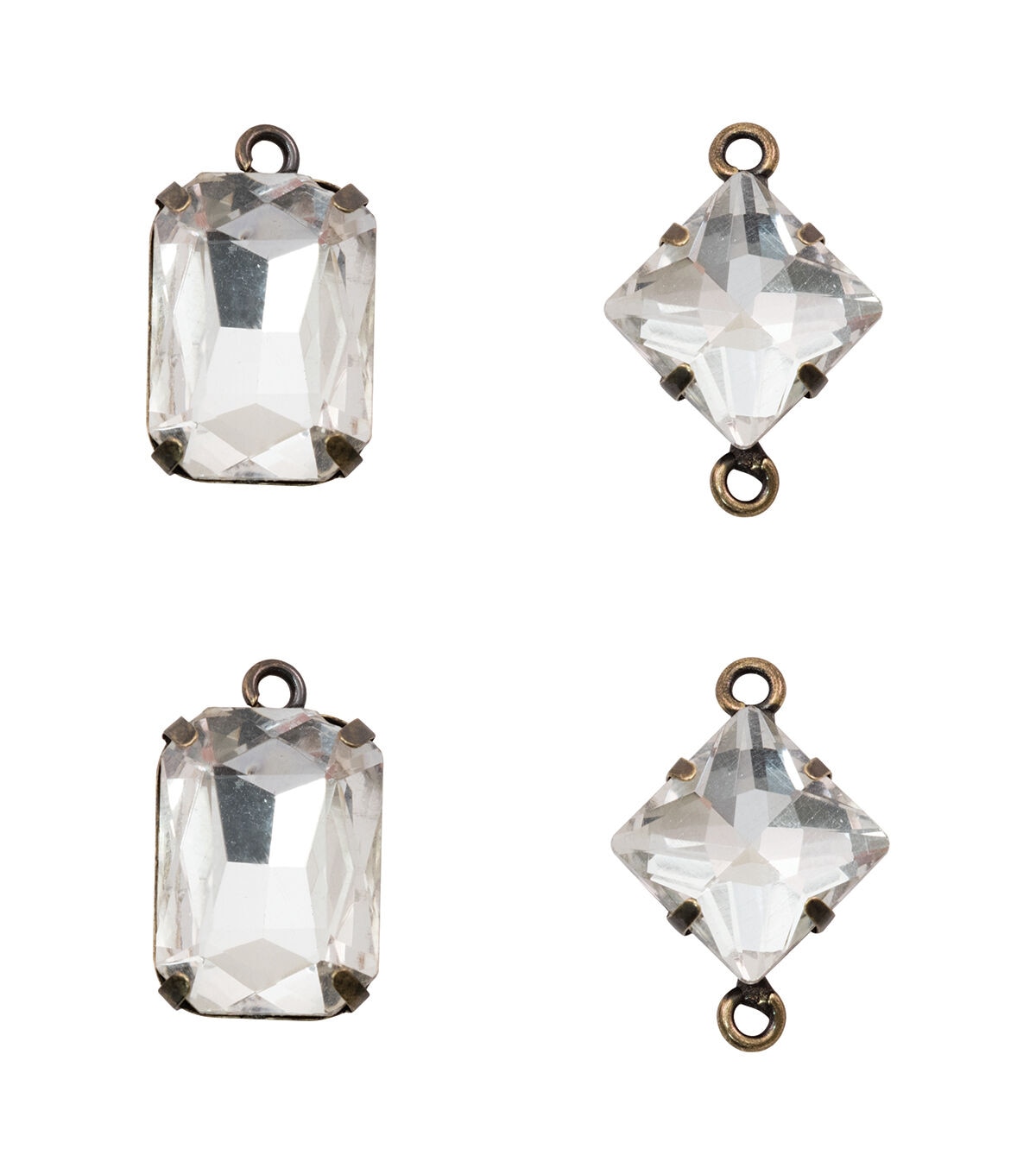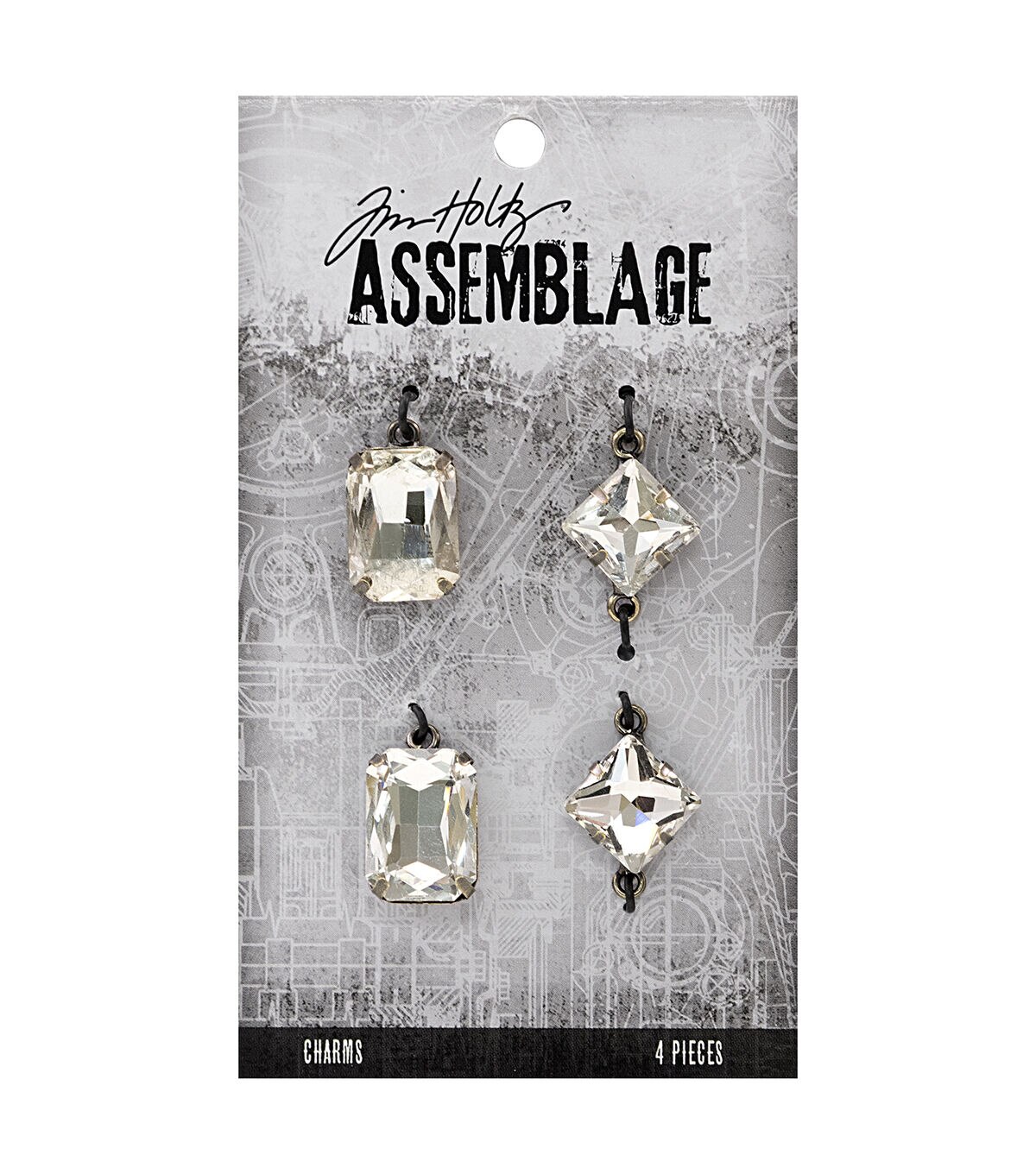 Take up a new jewelry project with the Tim Holtz Assemblage Faceted Gems Charms. Designed exclusively for JOANN by designer Tim Holtz, the Assemblage collection is a gathering of various elements and unrelated objects to create unique, wearable designs, ranging from vintage shabby and deco glam to urban hipster and industrial. The pack contains four faceted gem charms, including two emerald cut rhinestones with one loop for vertical hanging, and two diamond-cut rhinestones with two loops for vertical or horizontal hanging.