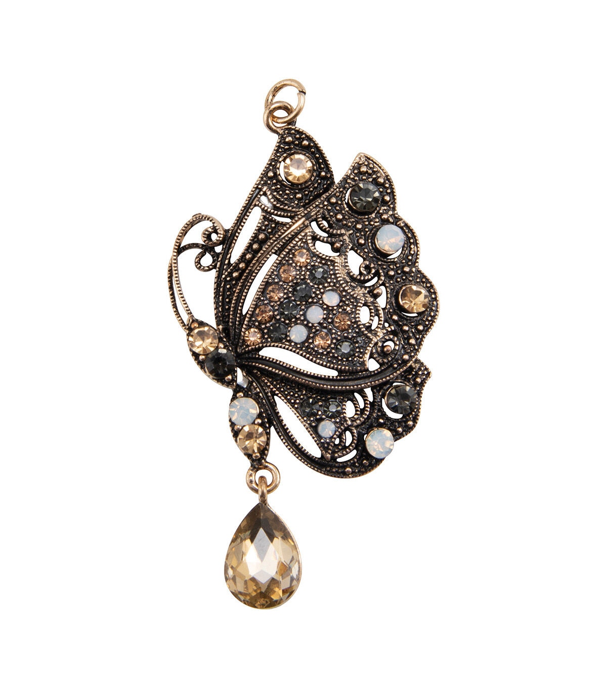 - This pendant features a side profile of a butterfly adorned with gold, black and iridescent rhinestones.