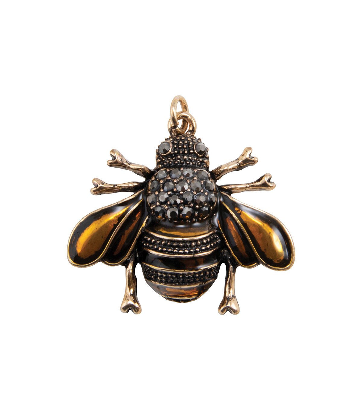 - This whimsical honey bee pendant features dark iridescent rhinestones, amber-colored stone accents and an antique gold finish. Includes a jump ring.