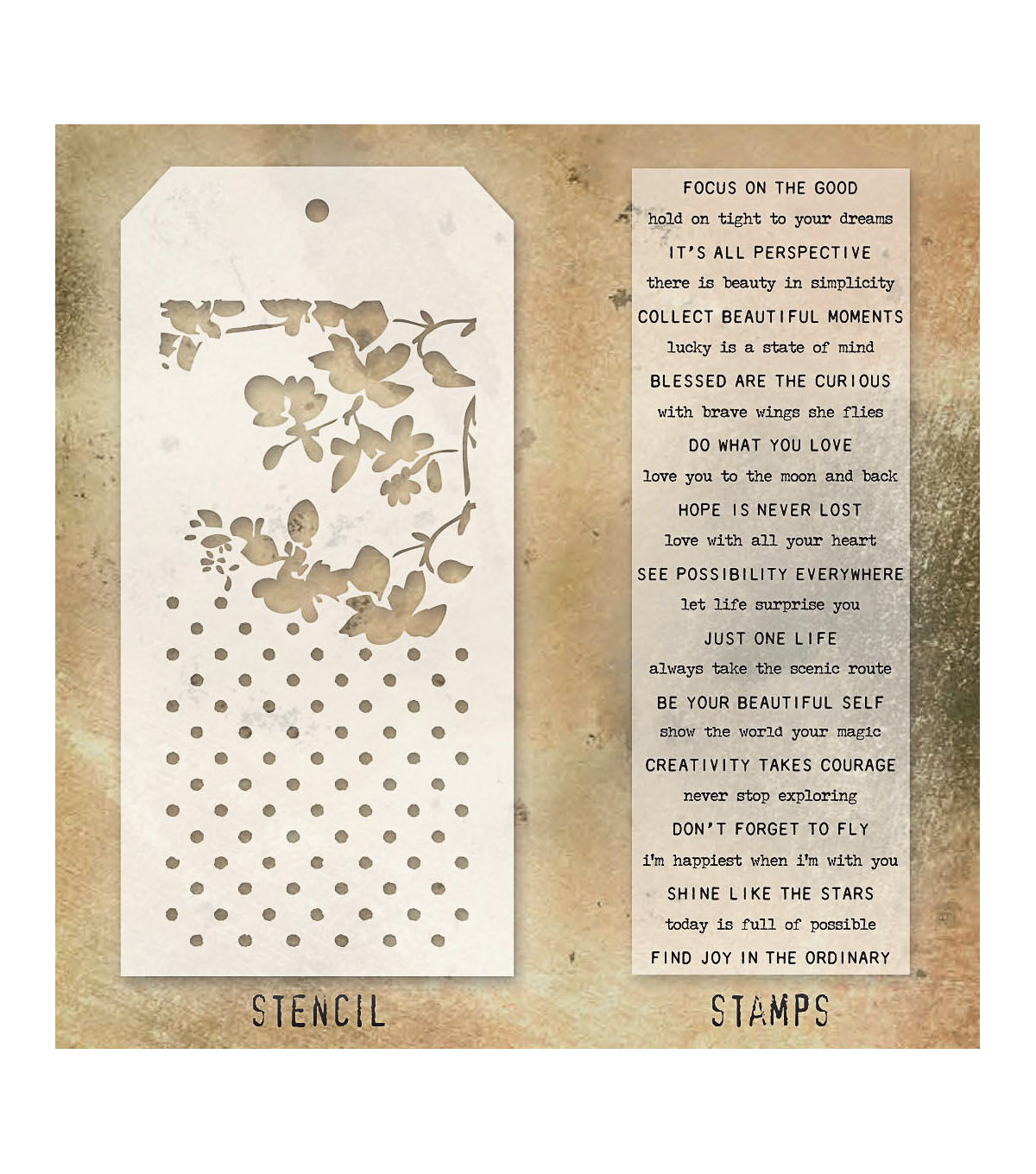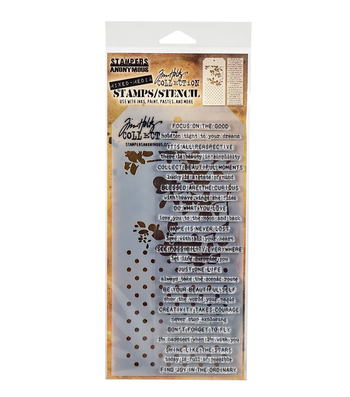 Tim Holtz Mixed Media Set includes clear stamps & a custom layering stencil designed to add texture & imagery to your creativity. Use with your favorite inks, paints, sprays, and pastes for endless mixed media possibilities.
