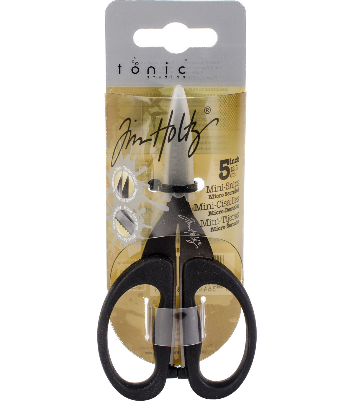 Cut little stamped images, ephemera or fabric pieces effortlessly, using the Tonic Studios Tim Holtz Micro Serrated Mini Snips. These 5-inch scissors from Tonic Studios are great for detailed cutting, and feature comfortable Kushgrip handles and micro-serrated, non-stick, titanium blades. They'll make a great addition to your craft, sewing or mixed media toolkit.