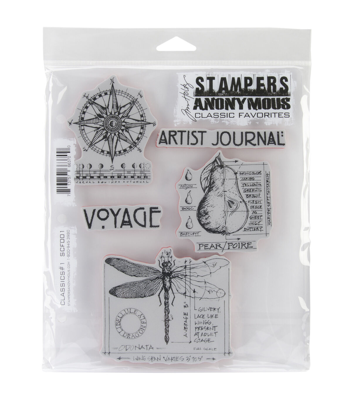 STAMPERS ANONYMOUS-Tim Holtz Collection: Cling Rubber Stamps This collection of stamps combines the fantastic quality of Stampers Anonymous rubber stamps with the amazing designs of Tim Holtz. Each set of stamps comes mounted on an 8-1/2x7 inch sheet of clear acrylic which has been three-hole punched for easy inclusion into a storage binder. Available in a wide variety of design sets (each sold separately). Number of stamps per package may vary by design. Storage binder not included. Made in USA.