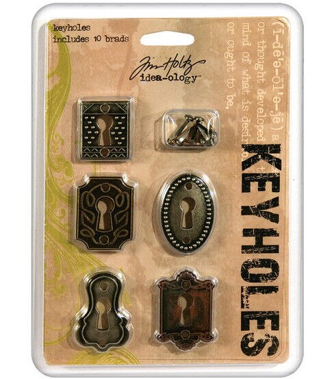 Add an element of mystery to your scrapbooks, journals, greeting cards, memory books and more with the Tim Holtz Idea-Ology Keyholes Fasteners. These decorative keyholes are intricately designed with fine details and offer antique style. Use these metal accents to complement the Idea-ology Work Keys, sold separately.