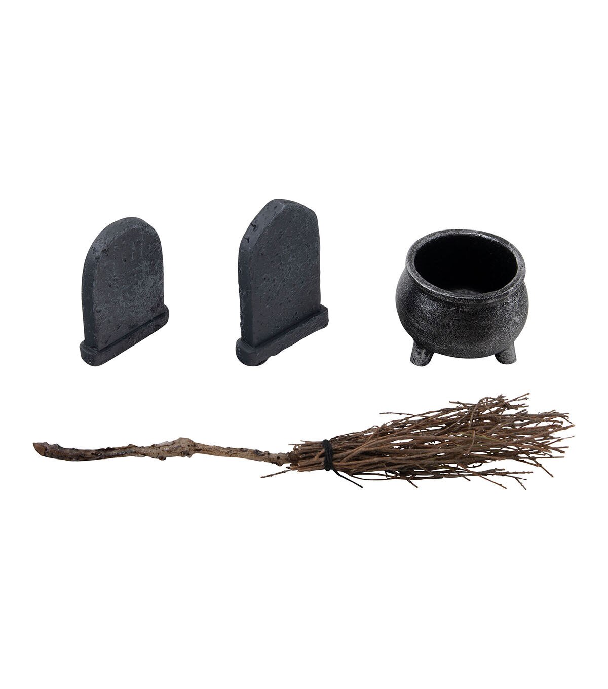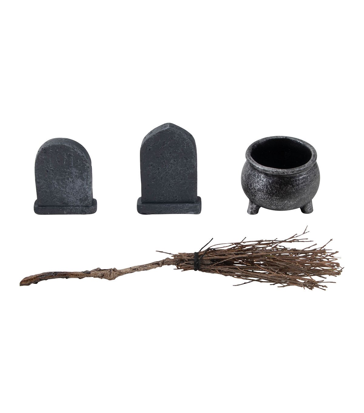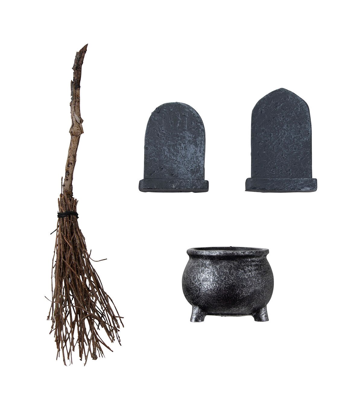 - Cauldron measures 1-1/2" in width and 1-1/4" in height, grave marker measures 1-1/4" in width and 1-1/2" in height, broom measures 5-1/2" in length