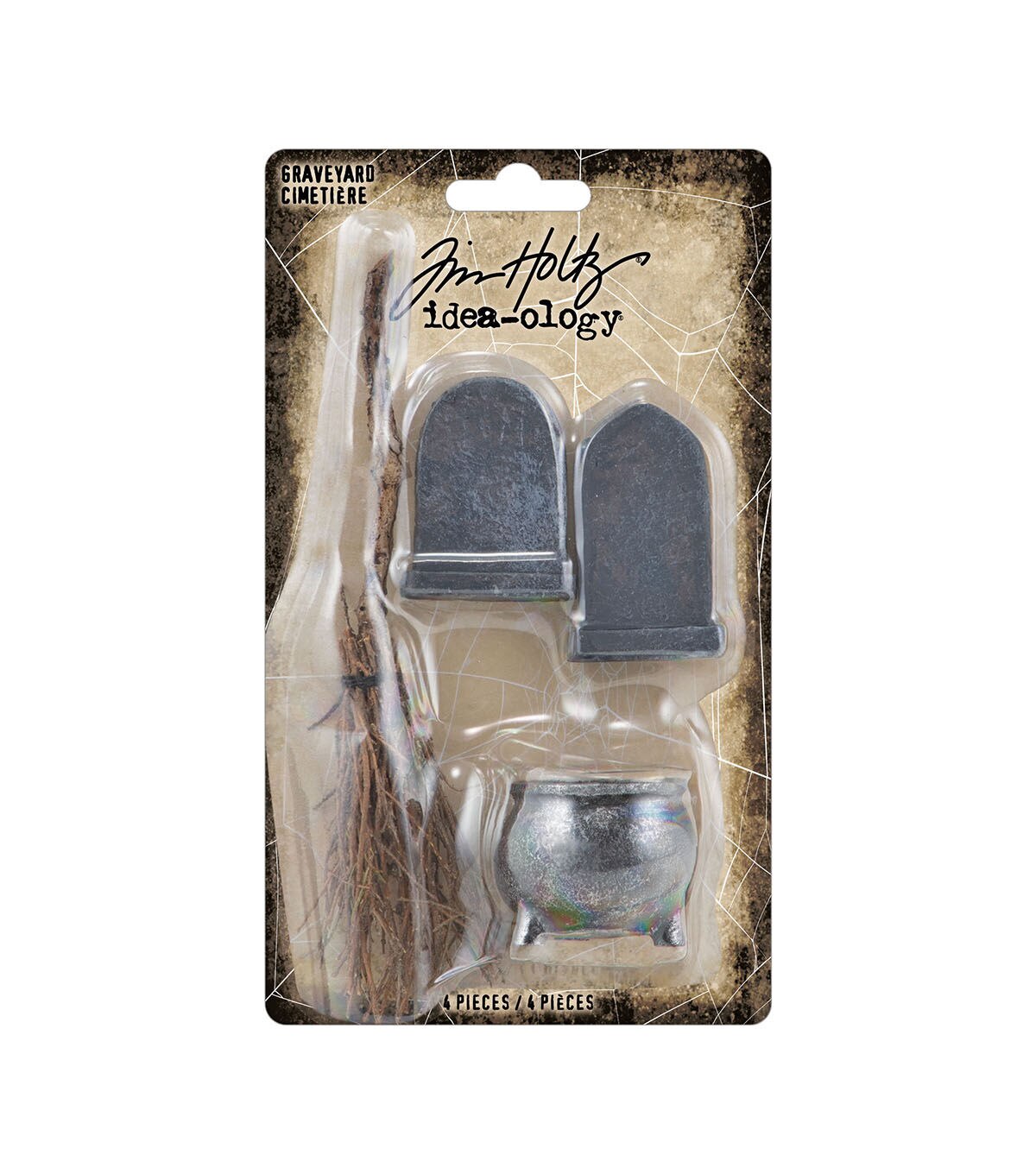 Gothic grave markers, a cauldron and broom are the perfect combination for a Withches Brew! Add Tim Holtz Cauldron, Grave Markers and Broom to your next miniature Halloween scene for a haunting touch.