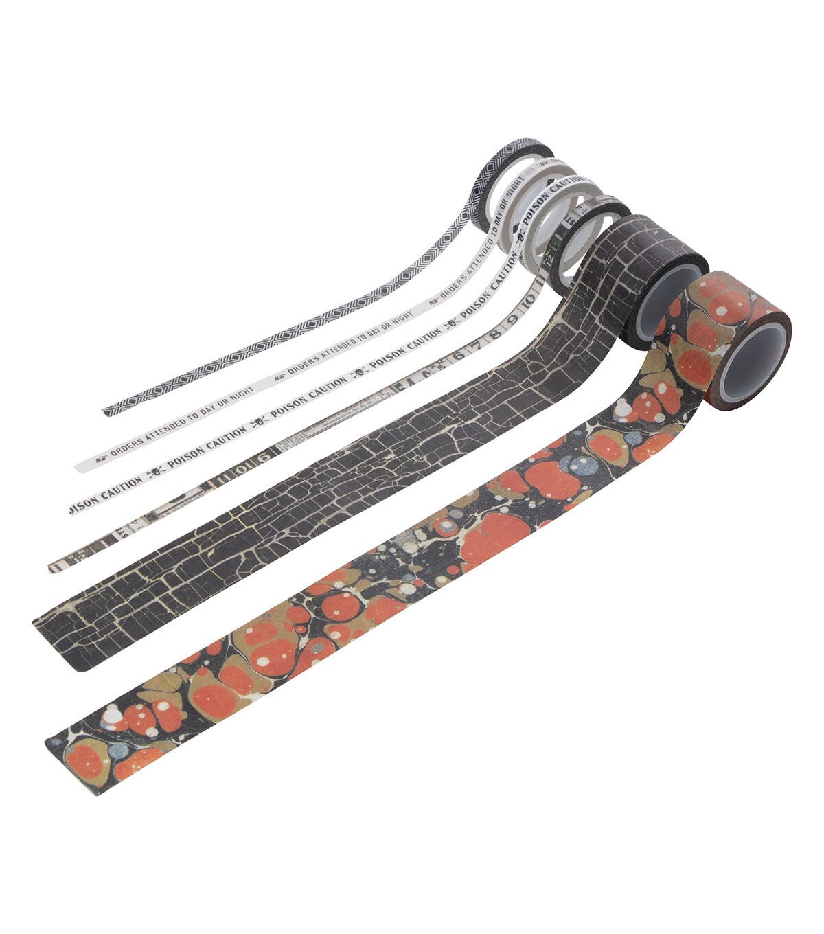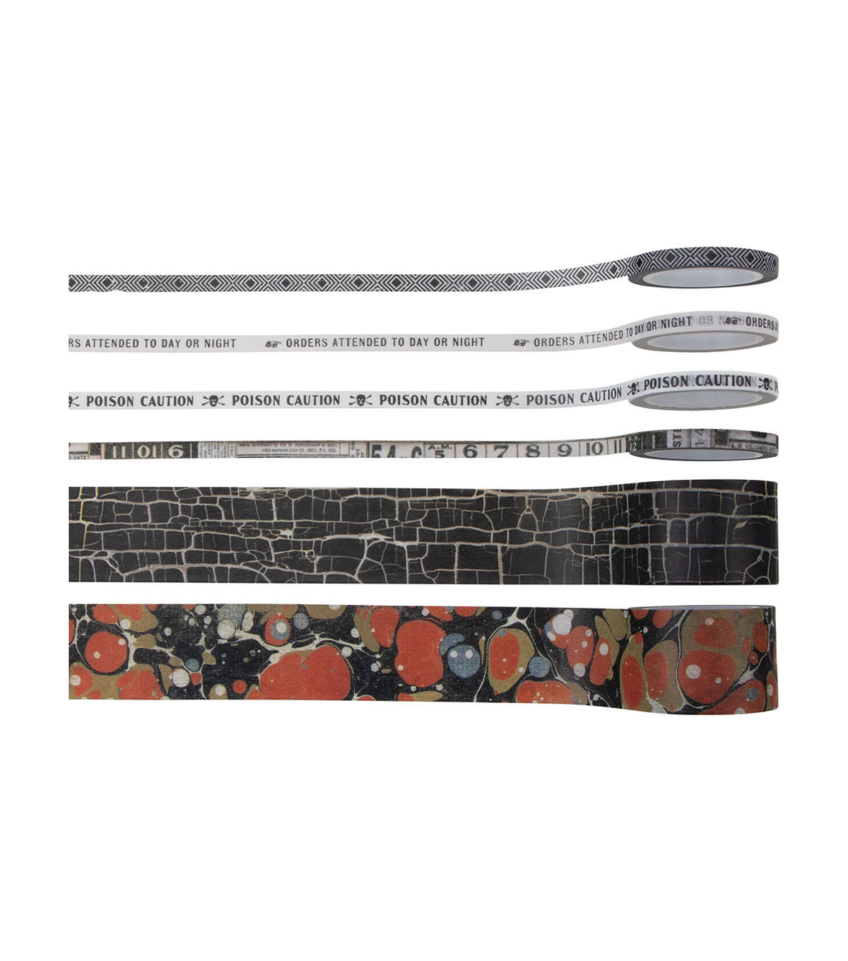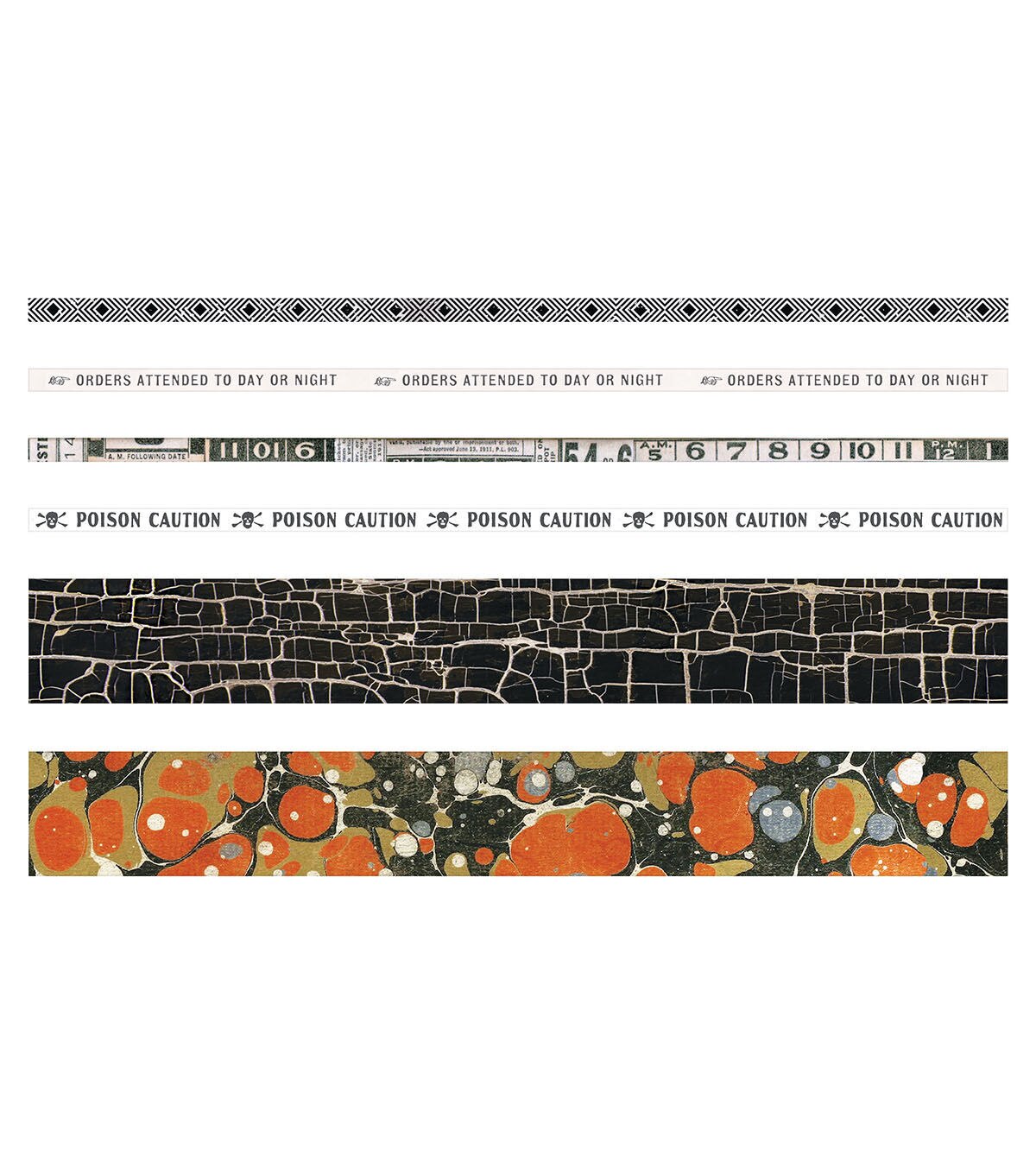 Travel through time with Tim Holtz Halloween Design Tape —an assortment of 6 tape rolls in 2 different sizes. The thinner rolls are sized perfectly to finish the edges of the Tim Holtz Vignette Boxes and the larger roll for the sides. Or use the tapes as a decorative trim for an creative project.