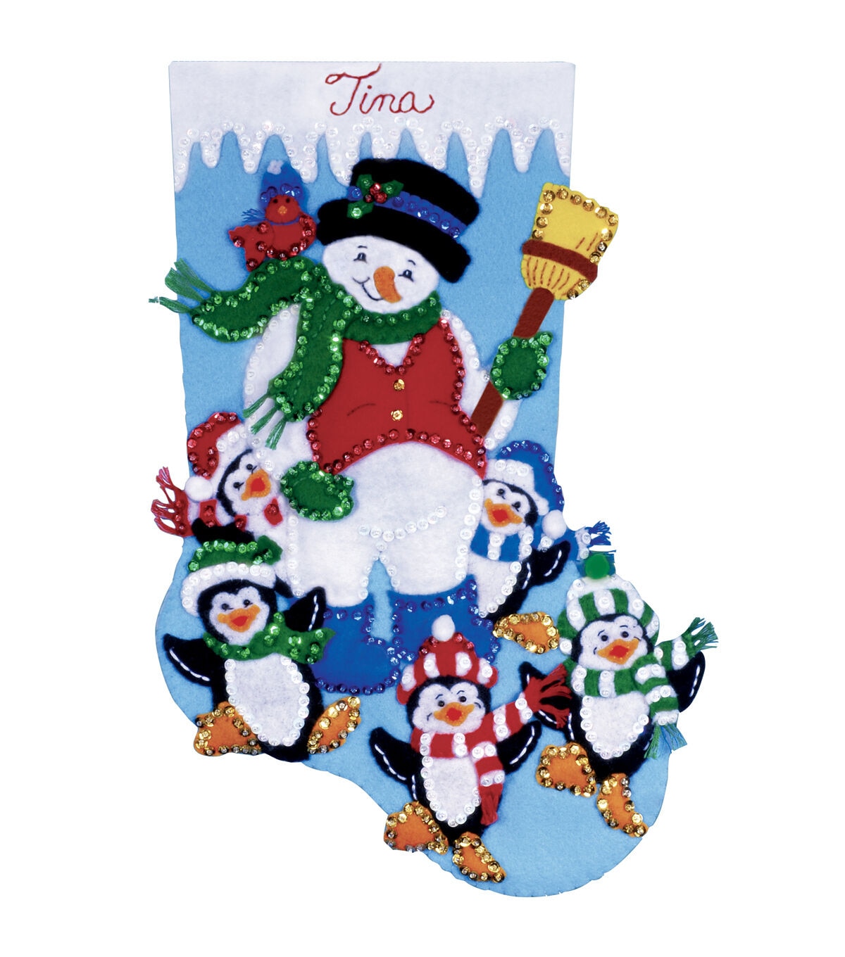 TOBIN-Stocking Felt Applique Kit. Create a personalized stocking with this kit. This package contains felt; sequins; beads; trims; cotton floss; a needle; patterns; and instructions. Finished size: 16 inches long. Design: Penguin Party. Made in USA.