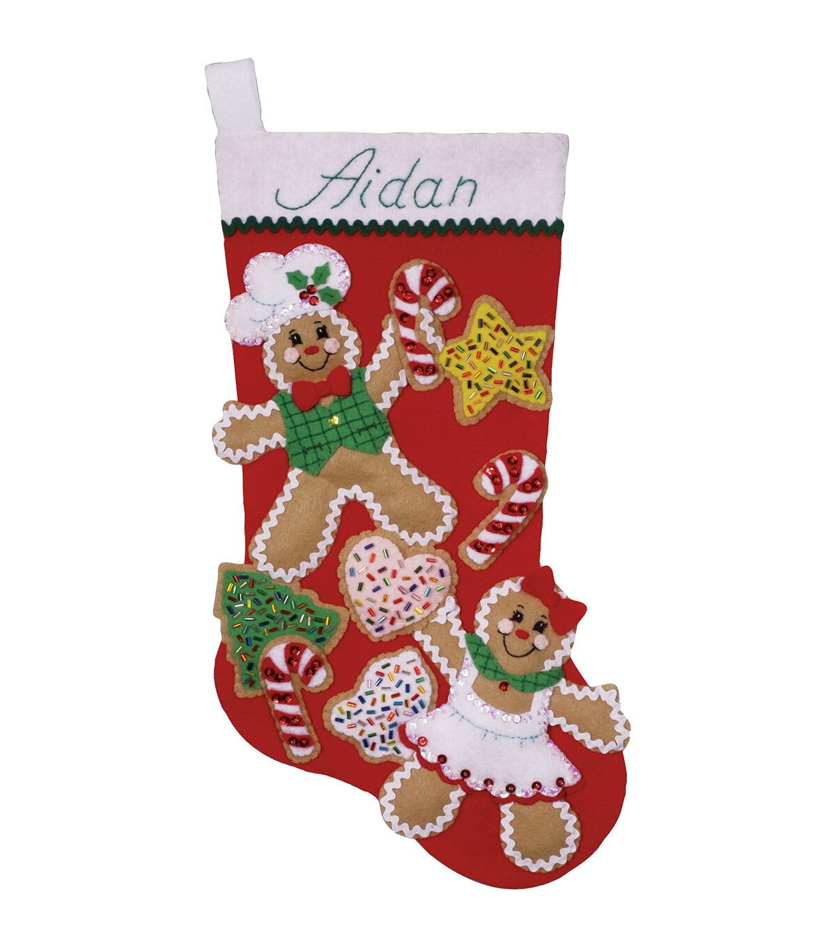 Use the Tobin Design Works Gingerbread Friends Stocking Felt Applique 18'' to create a lovely festive stocking. The DIY felt applique stocking kit contains sequins, beads, felt, cotton floss, varied trims, patterns, a needle and instructions. The finished size of the felt applique stocking measures 18 inches long. Hang it over the fireplace, on a door or use it as a wall hanging in the living room to complement the festive spirit.