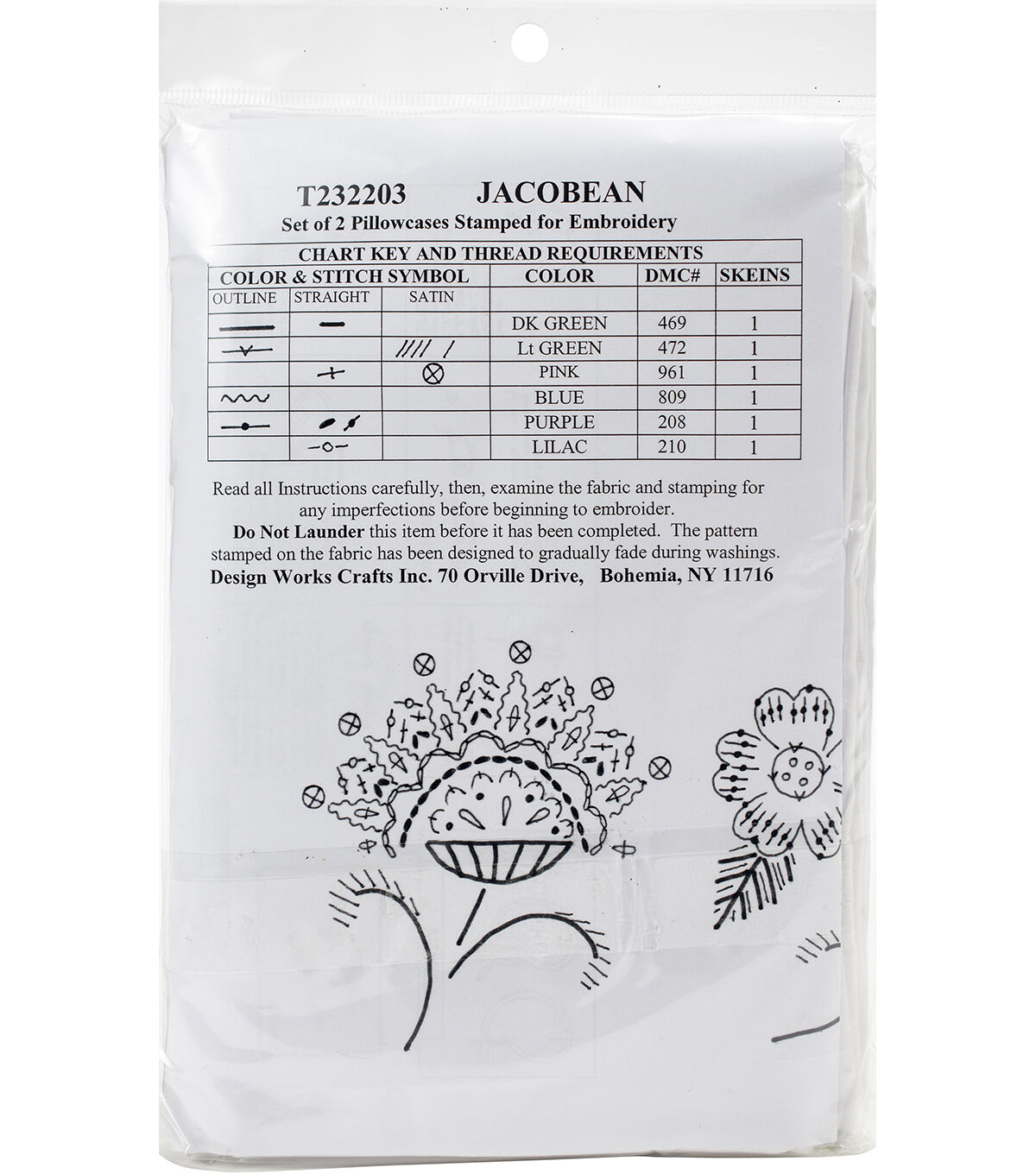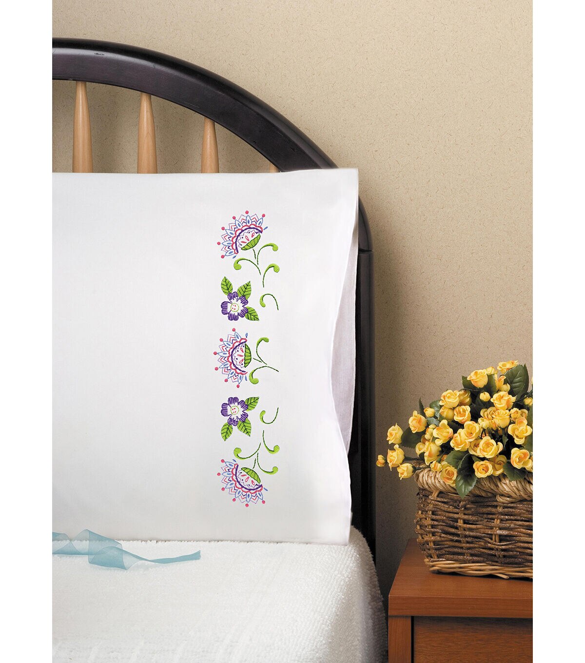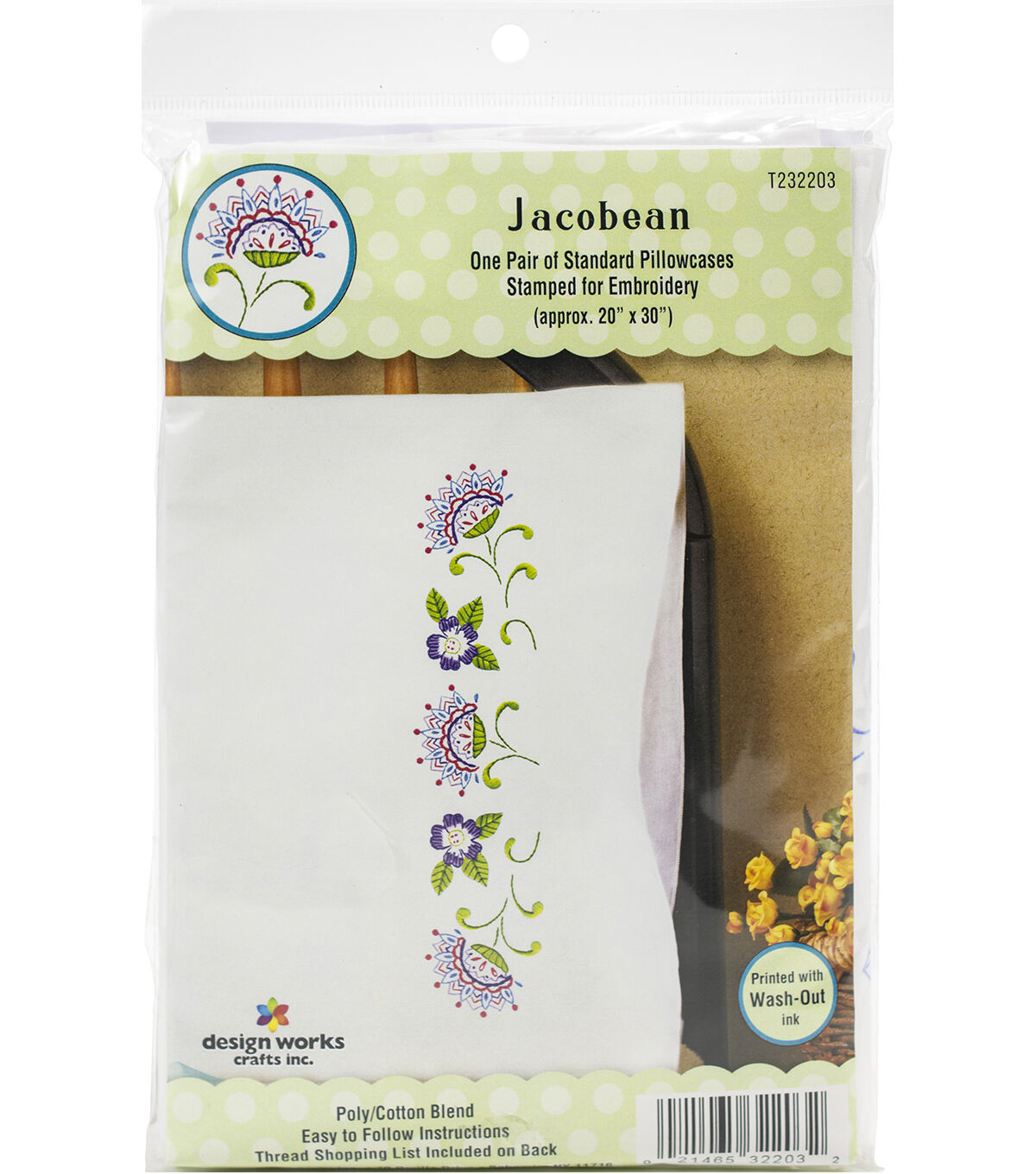 A great way to put your own creativity in a room! This package contains two poly/cotton blend pillowcases, easy to follow instructions and a tread shopping list on back. 180 thread count. Finished size: 20x30 inches. Design: Jacobean. Made in USA.