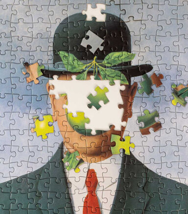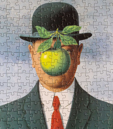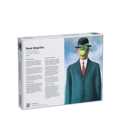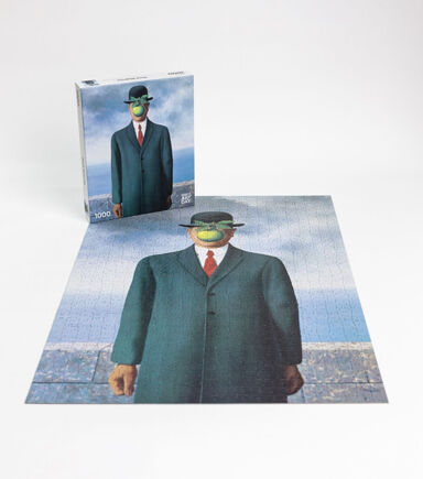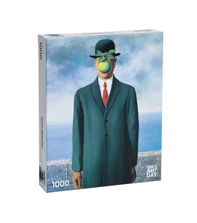 Dimensions : 50 cm x 70 cm 10.5" x 27.5" 1,000 pieces About The Son of Man Perhaps the most well-known artwork of Belgian surrealist painter René Magritte, The Son of Man is in fact a self-portrait. The man standing in an overcoat and a bowler hat is Magritte himself, but his face is largely obscured by a hovering green apple. However, the man’s eyes are visible, discreetly peeking over the edge of the apple.
