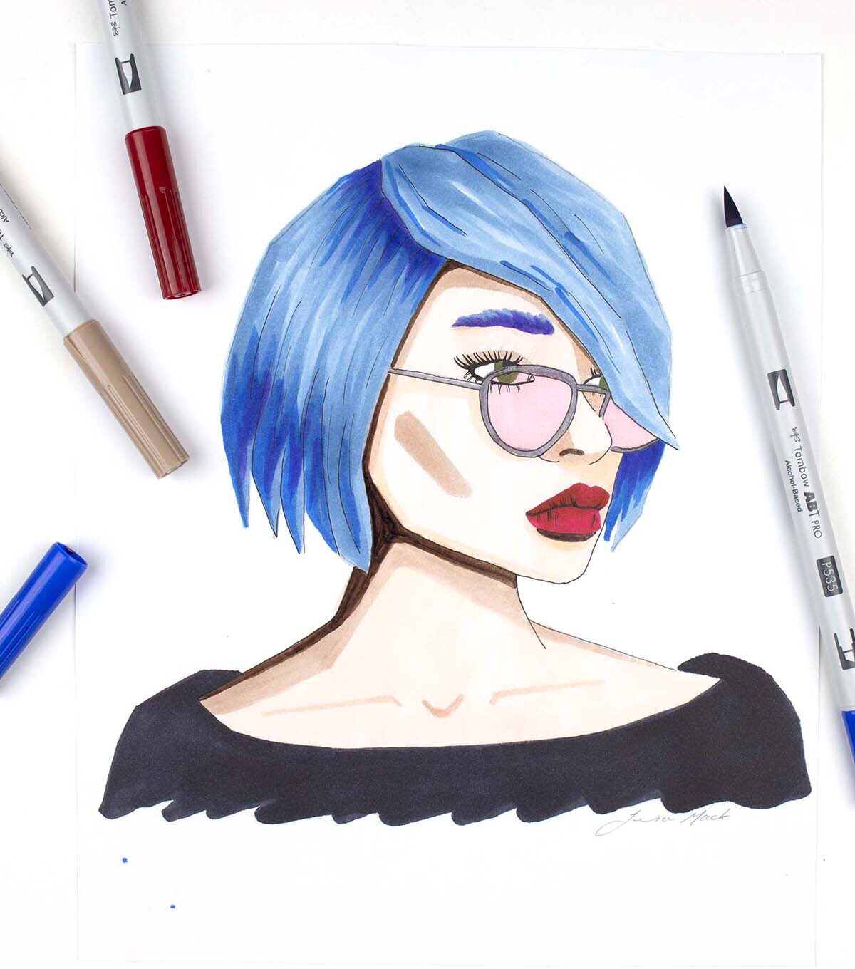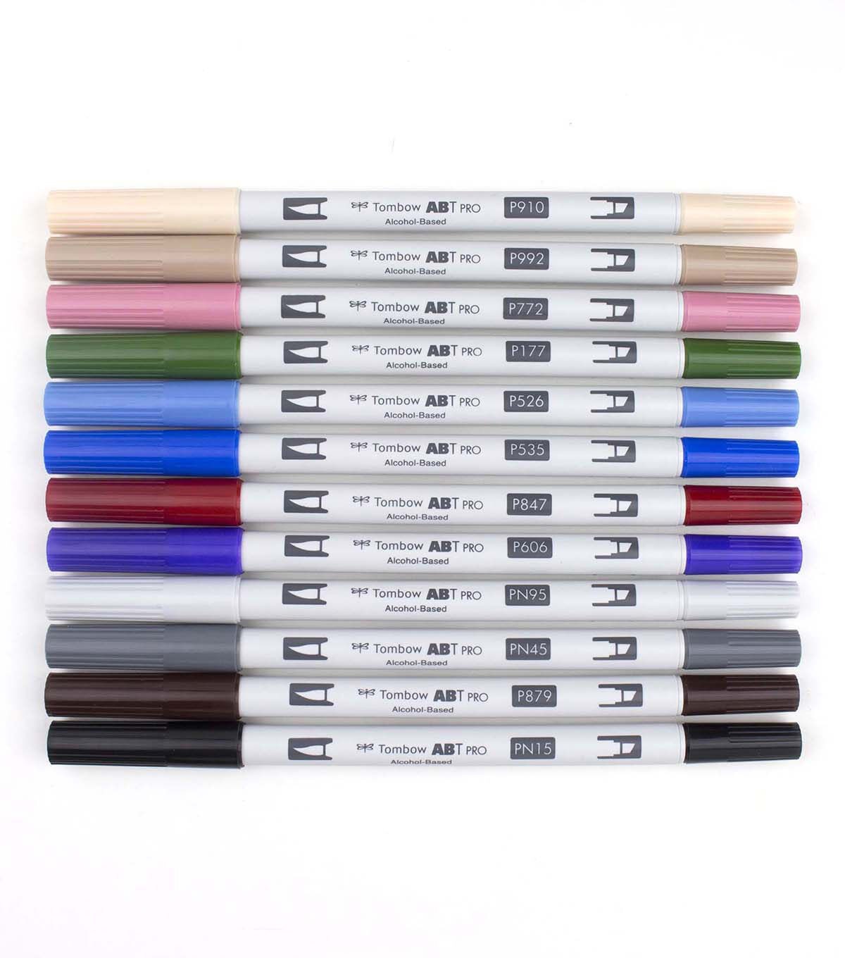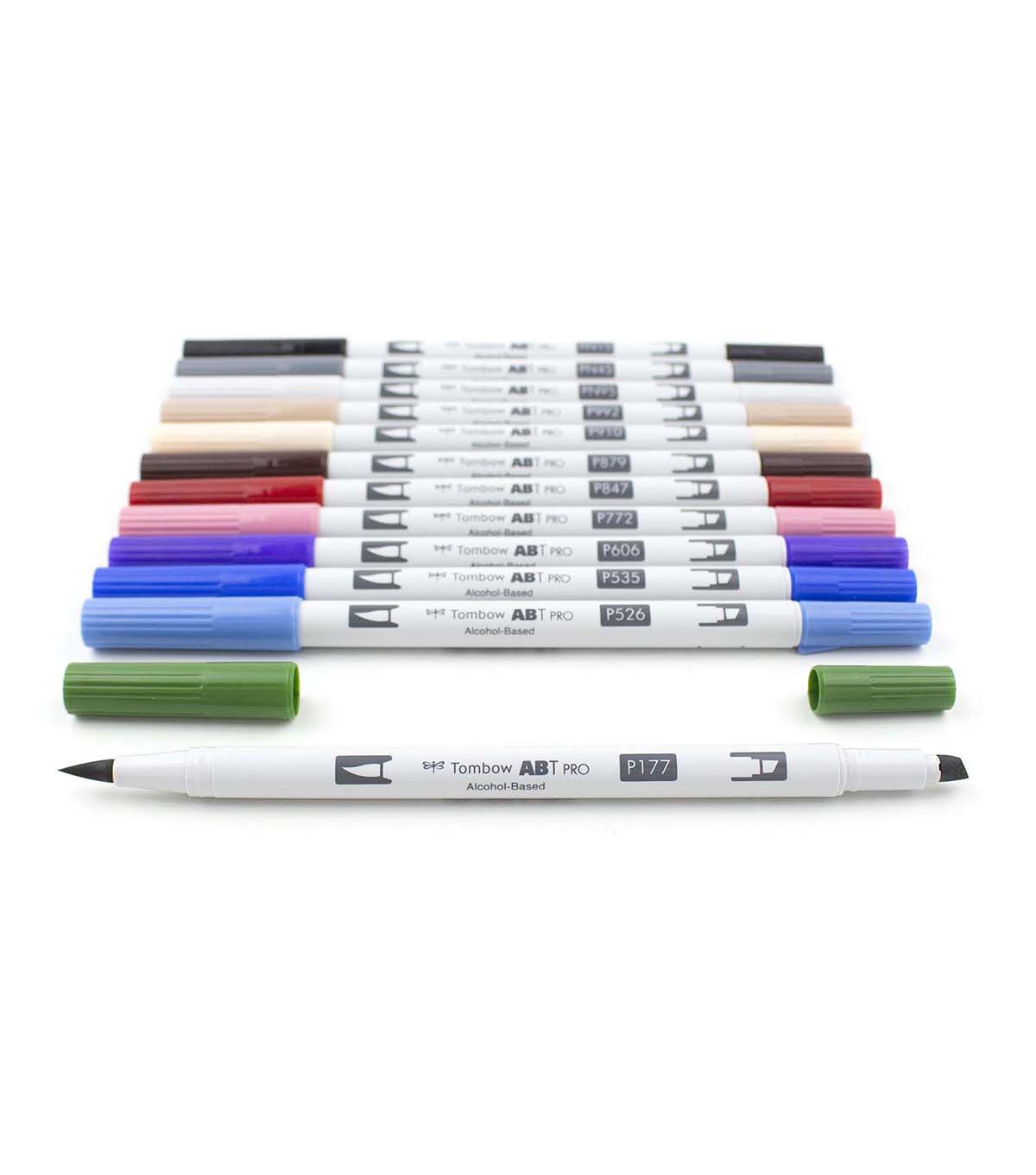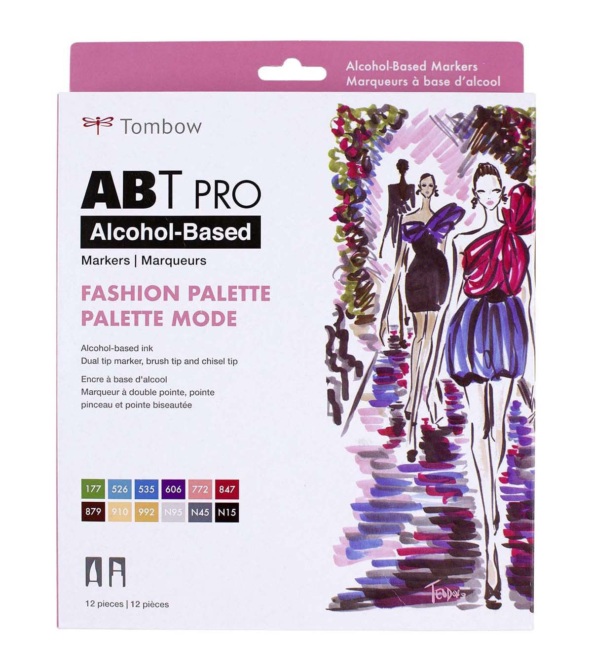 ABT PRO is a permanent dual tipped art marker with flexible brush tip and chisel tip in one. "Fashion" color 12 pcs assortment, including reusable and stackable desk tray. Brush tip works like a paintbrush to create fine, medium or bold strokes by simply changing brush pressure; chisel tip provides consistent lines and broad coverage for coloring large spaces. Slender barrel for comfortable grip during use. Ideal for artists, designers and crafters. Permanent, fast-drying alcohol-based ink produces rich, vibrant colors that can be layered to create rich saturation, shading and color gradation. Durable nylon brush tip and polyester chisel tip retain shape after heavy use. Also available, Blender Pen with colorless blending ink is great for smoothing out color fields, creating gradations and manipulating or correcting color applications. Colors Include: P910 Opal, P992 Sand, P772 Dusty Rose, P177 Dark Jade, P526 True Blue, P535 Cobalt Blue, P847 Crimson, P606 Violet, PN95 Cool Gray 1, PN45 Cool Gray 10, P879 Brown, PN15 Black.