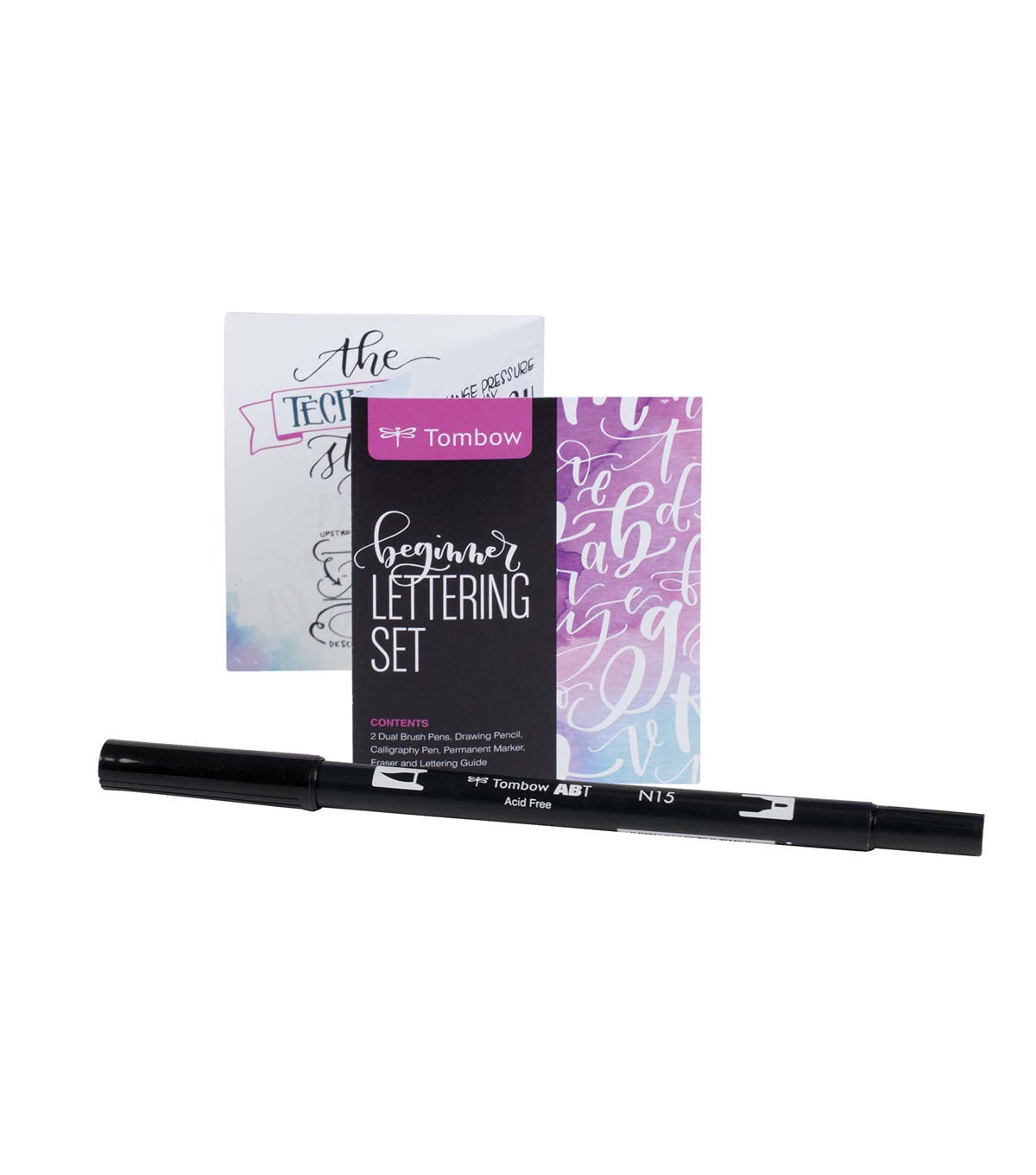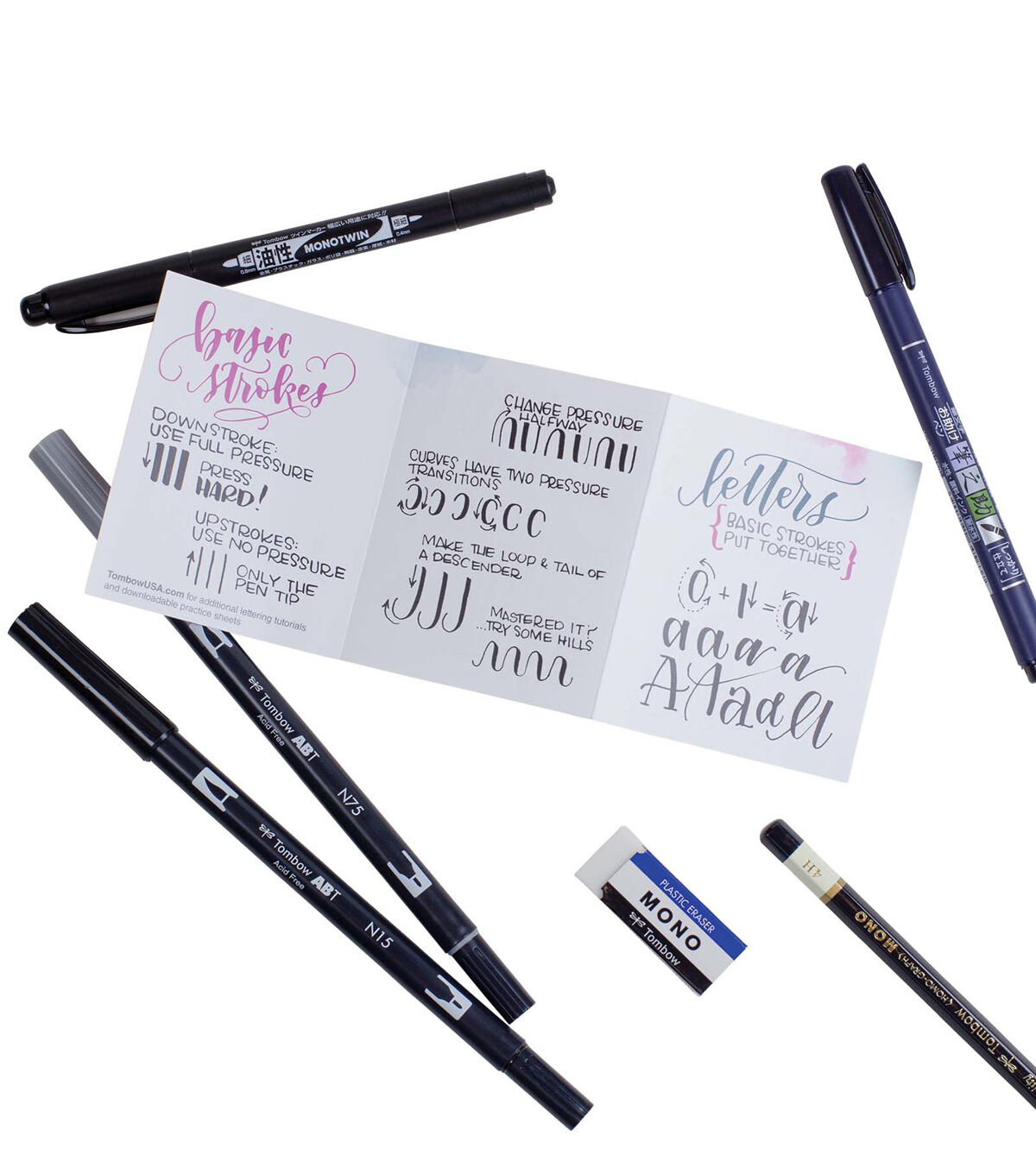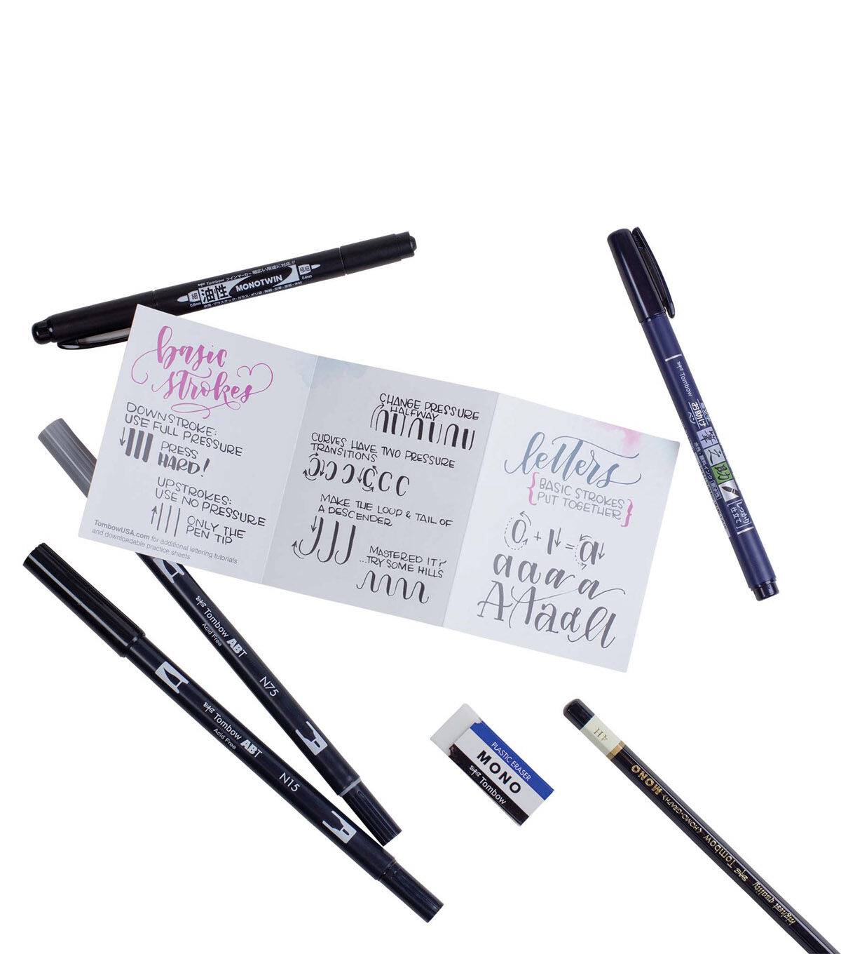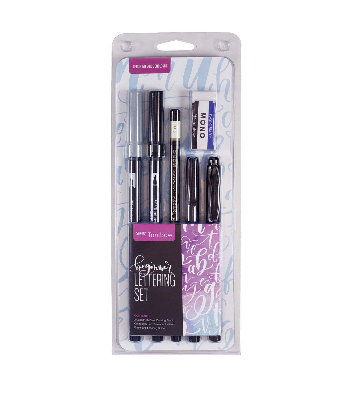 Learn lettering essentials with the Tombow Beginner Lettering Set. Includes everything you need to start handlettering, including a pamphlet with helpful tips to get started. Each set includes two Dual Brush Pens, Fudenosuke CalligraphyBrushPen, MONO Twin Permanent Marker, MONO Drawing Pencil and MONO Eraser.